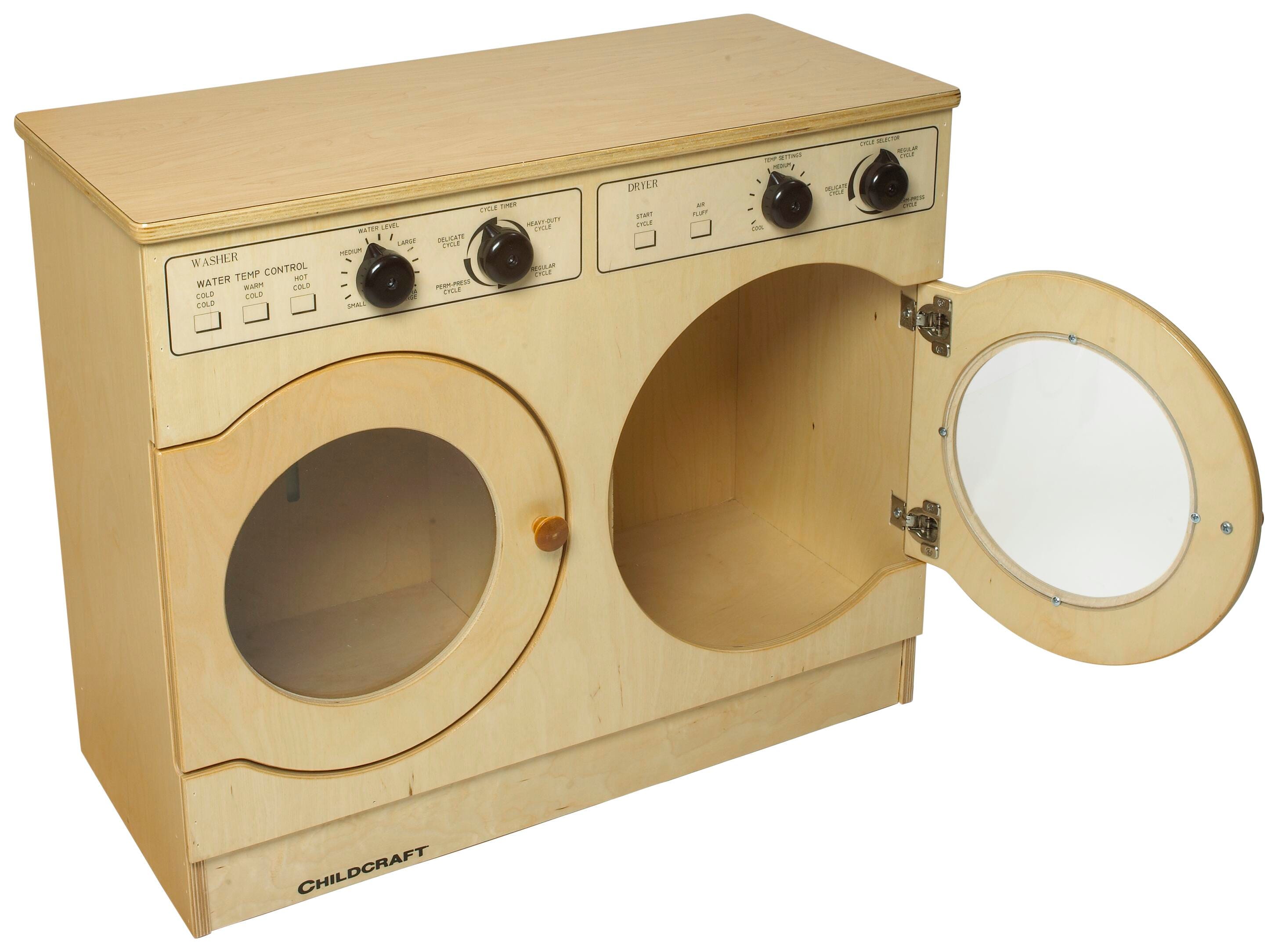 Childcraft® Play Washer and Dryer Set offers a fun and engaging way for children to learn household routines through imaginative role-play. This modern-style wooden play set features round front-loading doors and turnable play dials, allowing children to customize their pretend wash cycles. Designed with sturdy birch veneer panels, this durable washer and dryer set is built to last and makes a great addition to dramatic play areas in schools, childcare centers, and home playrooms. Encourages social interaction, fine motor skill development, and early learning. The full laundry play set measures 29-1/2 W x 13-3/8 D x 24-3/8 H inches.Features