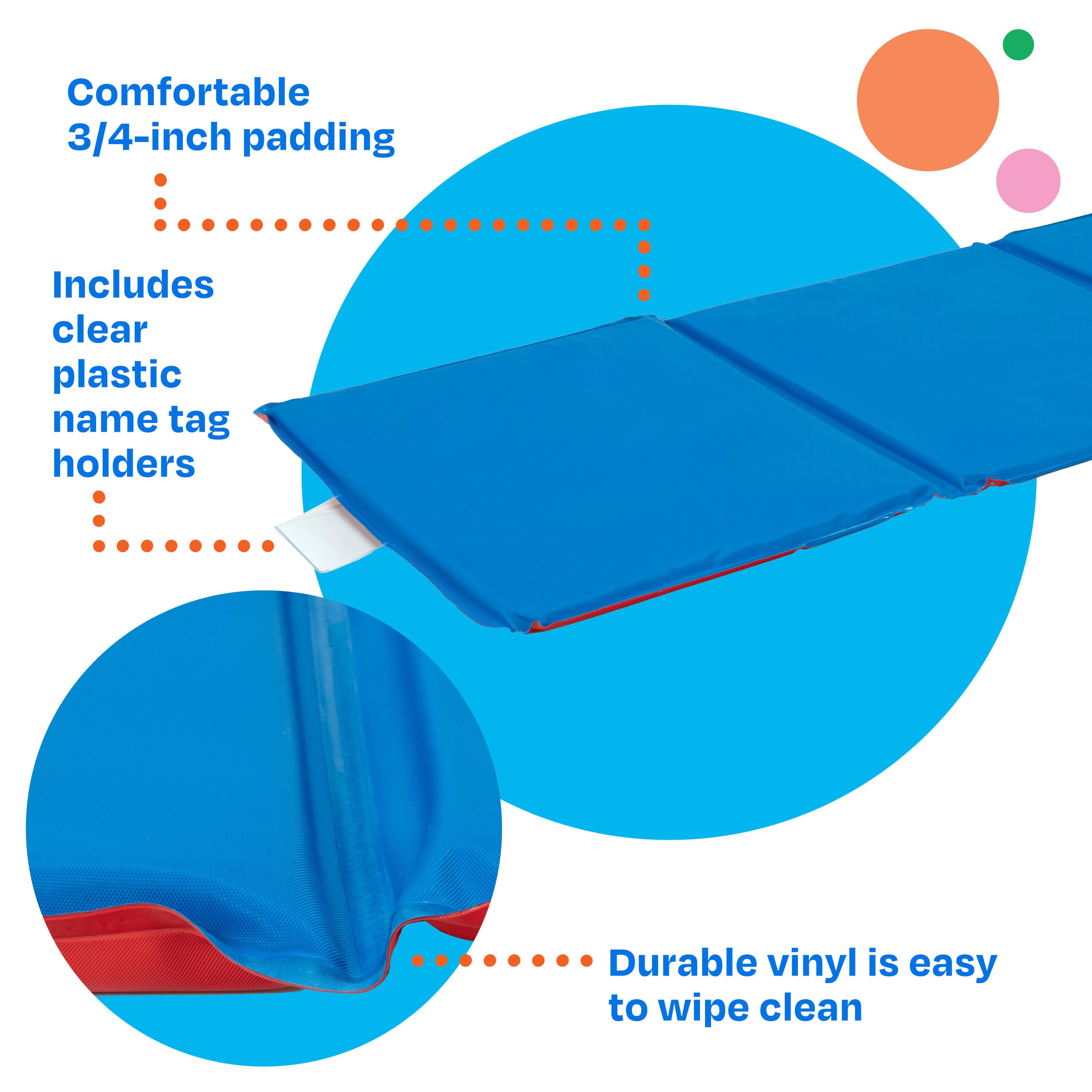 This Childcraft® Premium 3-Fold Rest Mat for classrooms is the perfect solution for naptime and relaxation. The foldable mat is padded and easy to wipe clean, combining comfort and durability for students and teachers. The sleeping mat is made using radio frequency vinyl welding technology to seal all seams and protect the foam padding from liquid and bacteria. Wipe clean to disinfect after each use. Lightweight and simple to take out/put away, the floor mat folds into 1/3 the size when not in use. Each sleeping pad includes a name tag holder for personalization. Measures 45 L x 19 W x 3/4 H inches.Features