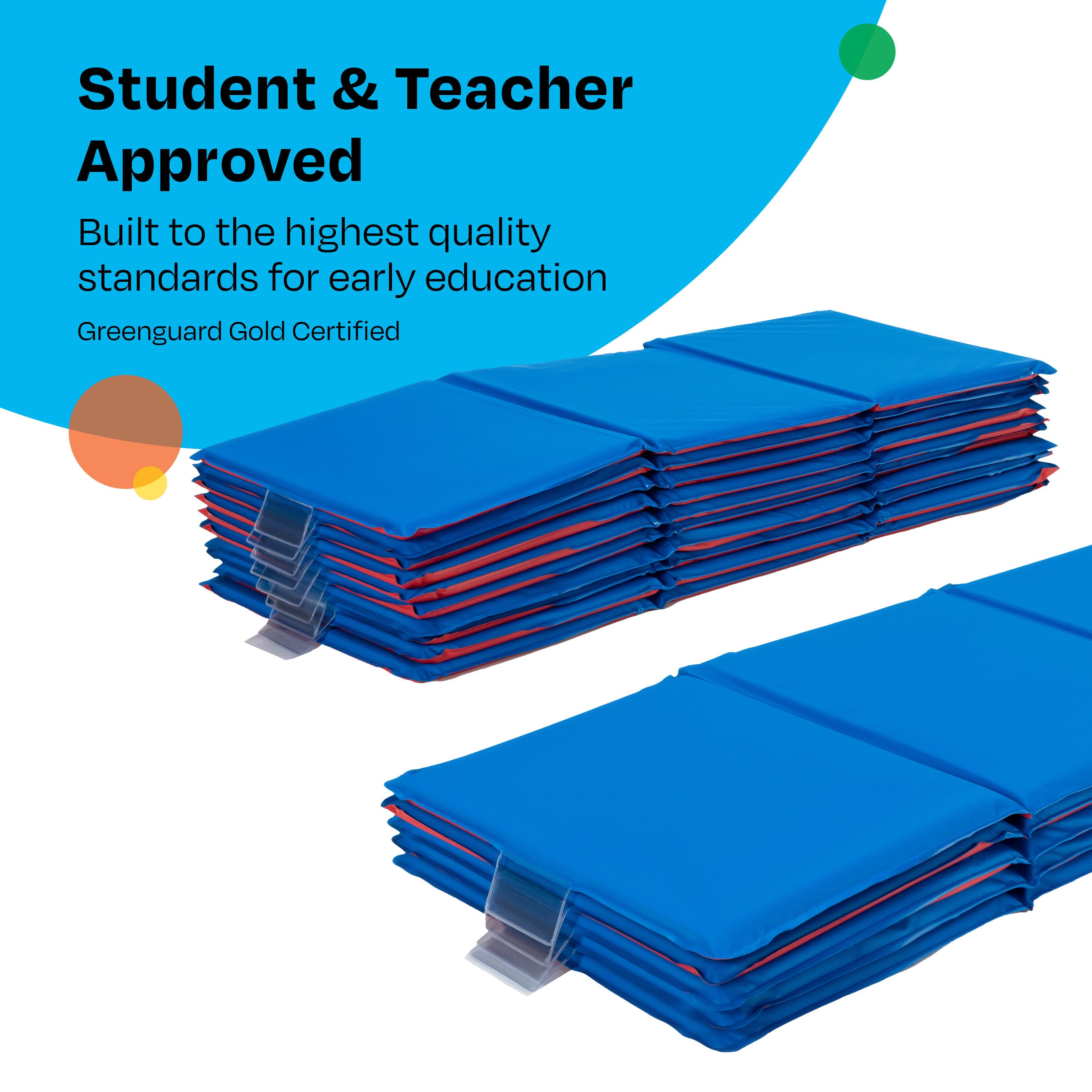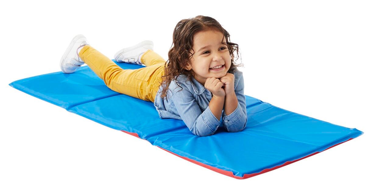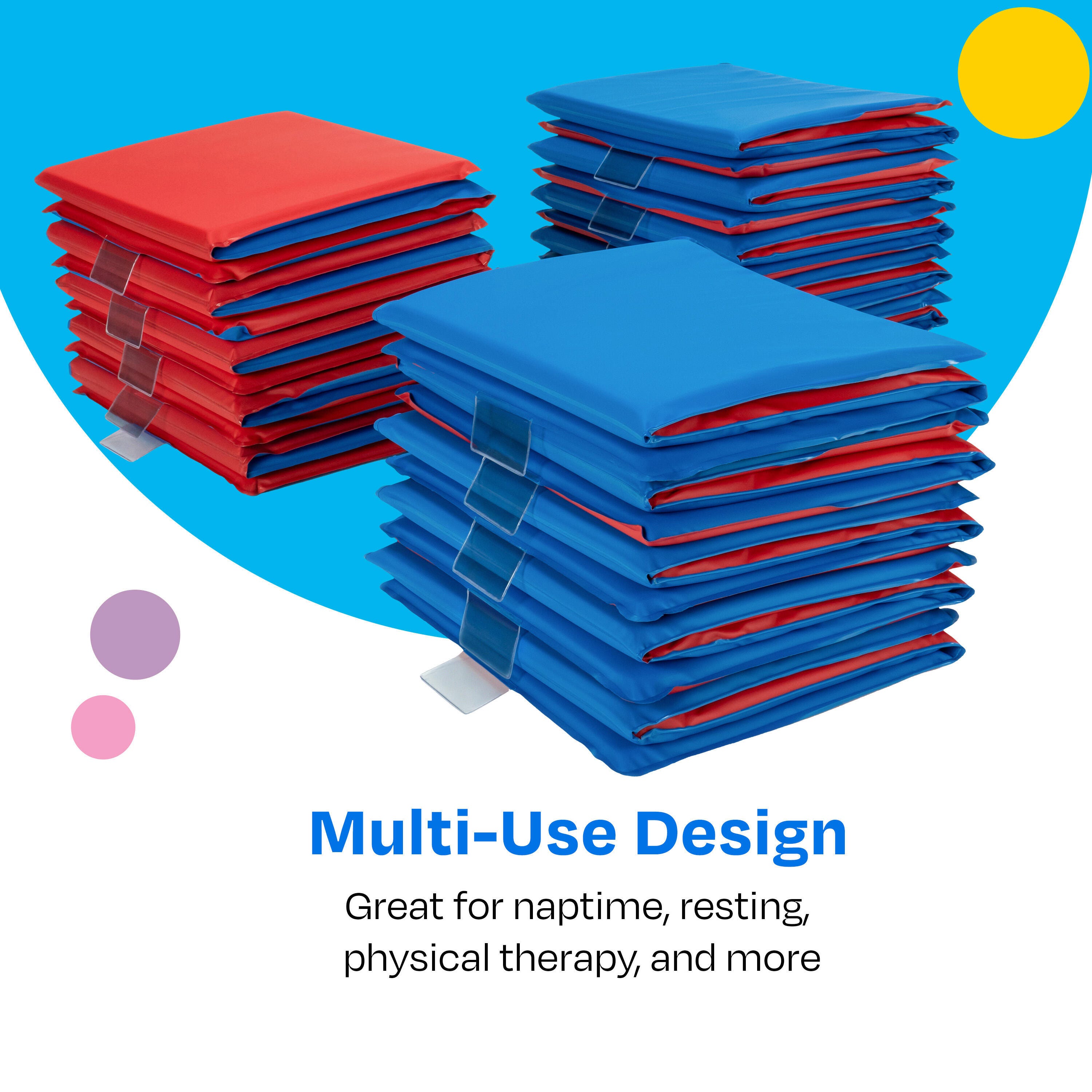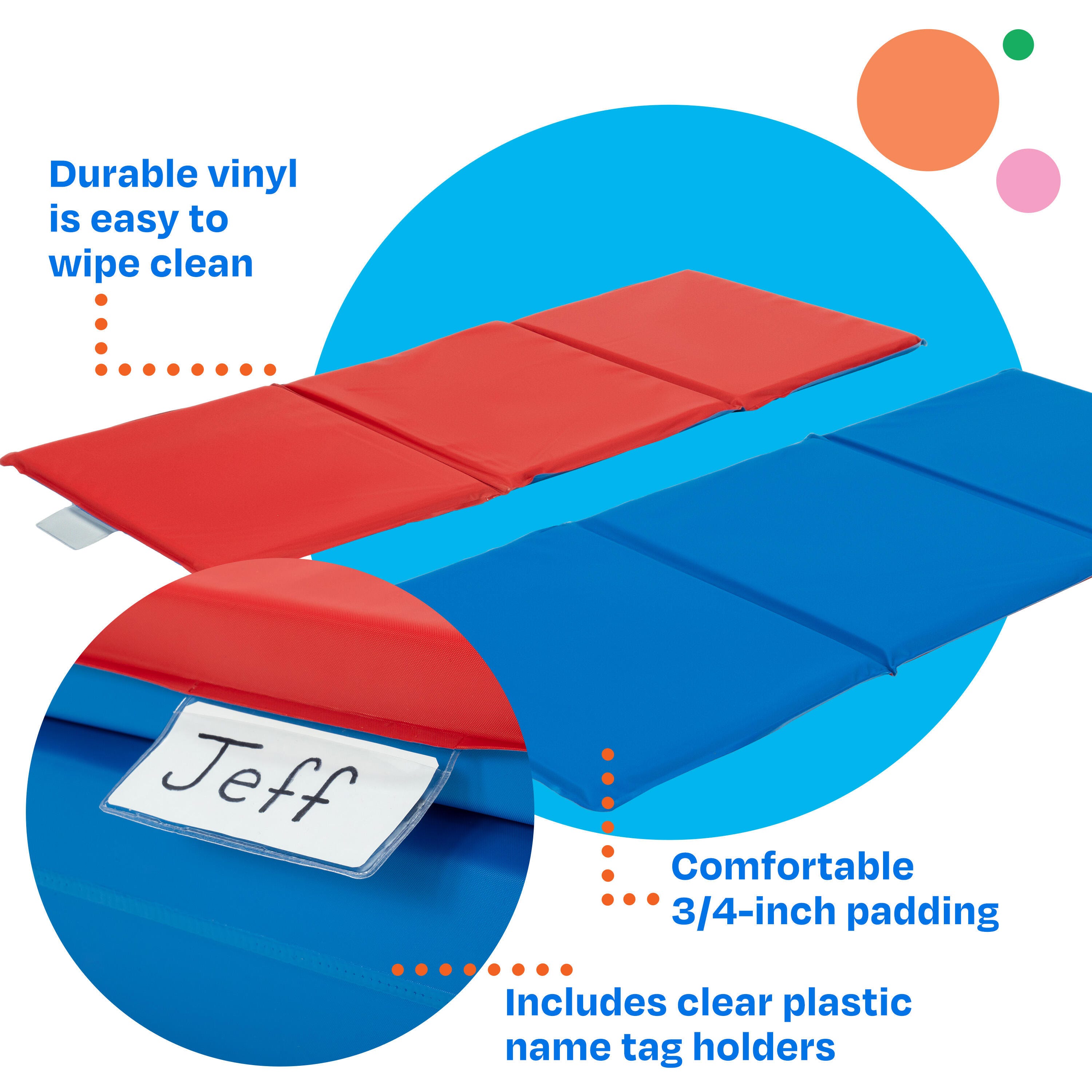 Childcraft® Premium 3-Fold Rest Mats for classrooms are the perfect solution for naptime and relaxation. Each foldable mat is padded and easy to wipe clean, combining comfort and durability for students and teachers. The sleeping mat is made using radio frequency vinyl welding technology to seal all seams and protect the foam padding from liquid and bacteria. Wipe clean to disinfect after each use. Lightweight and simple to take out/put away, the floor mat folds into 1/3 the size when not in use. Each sleeping pad includes a name tag holder for personalization.