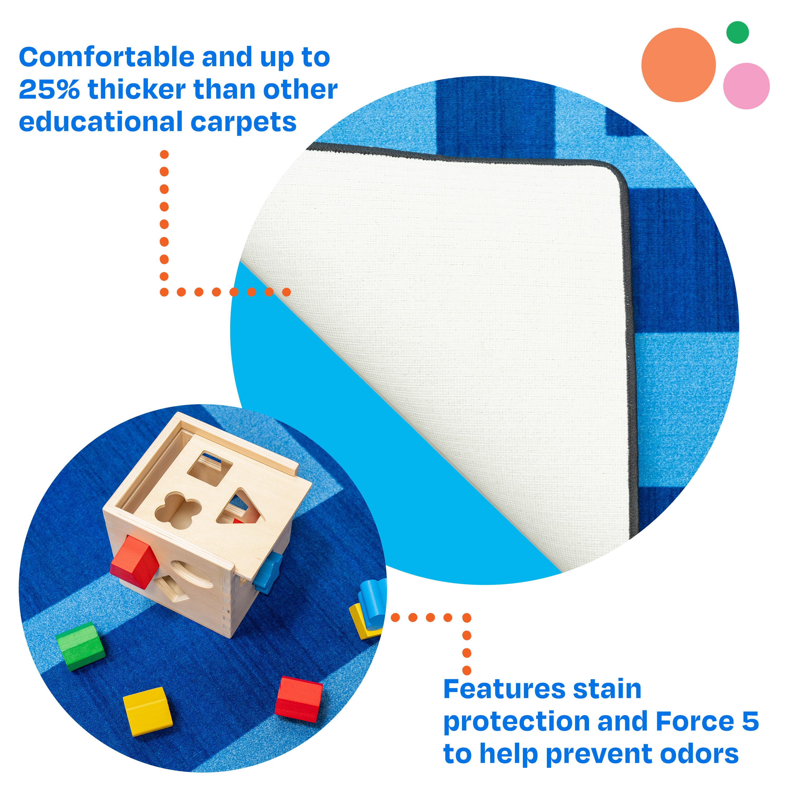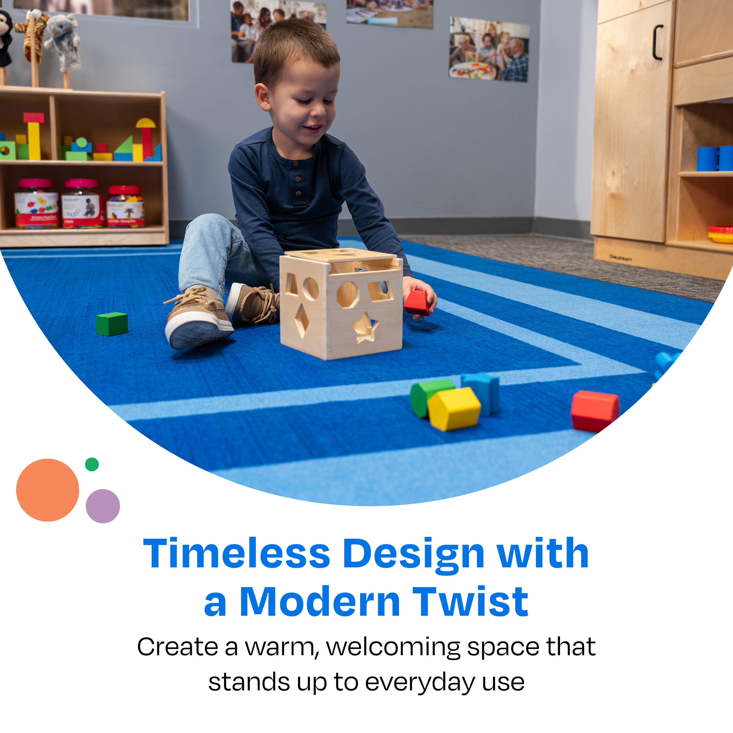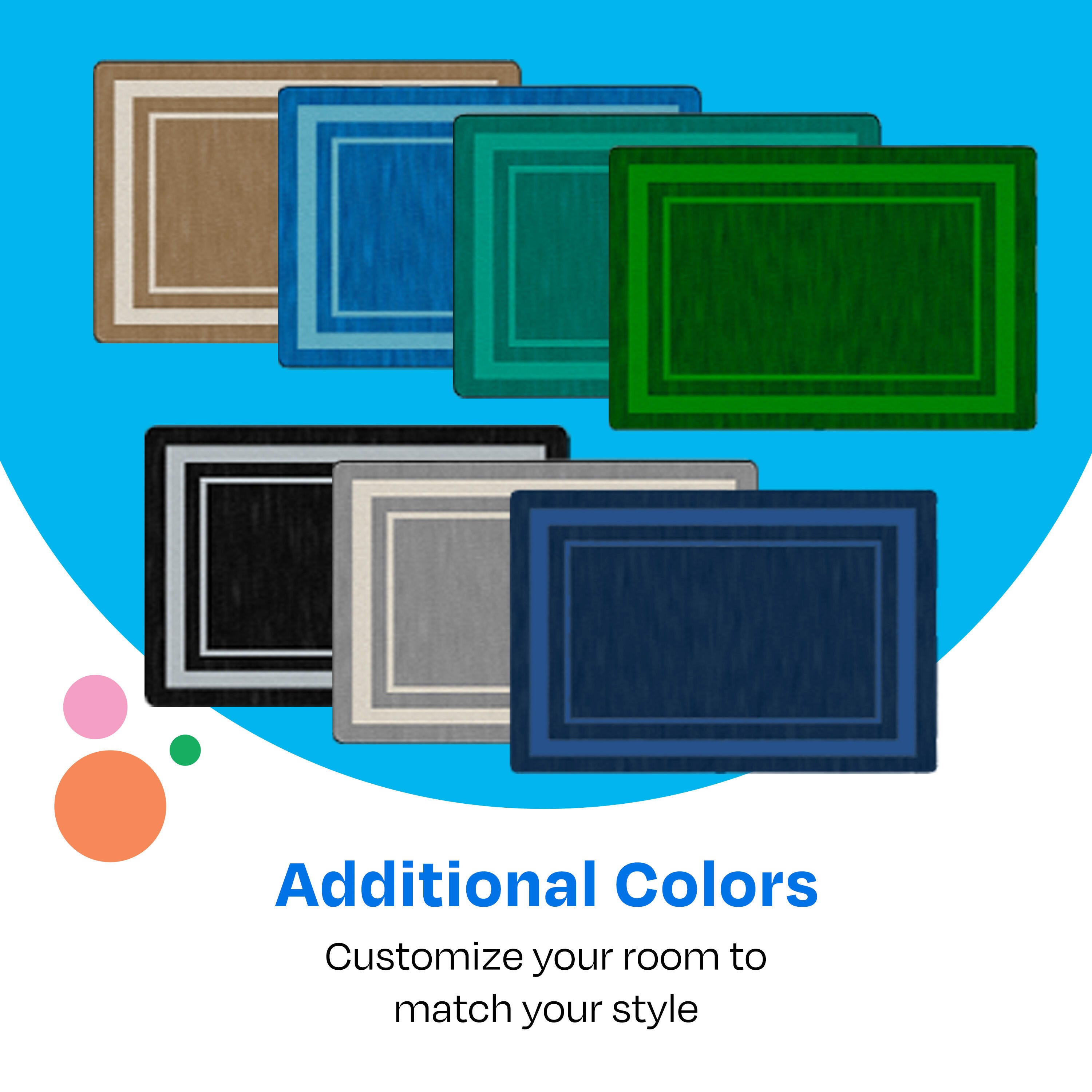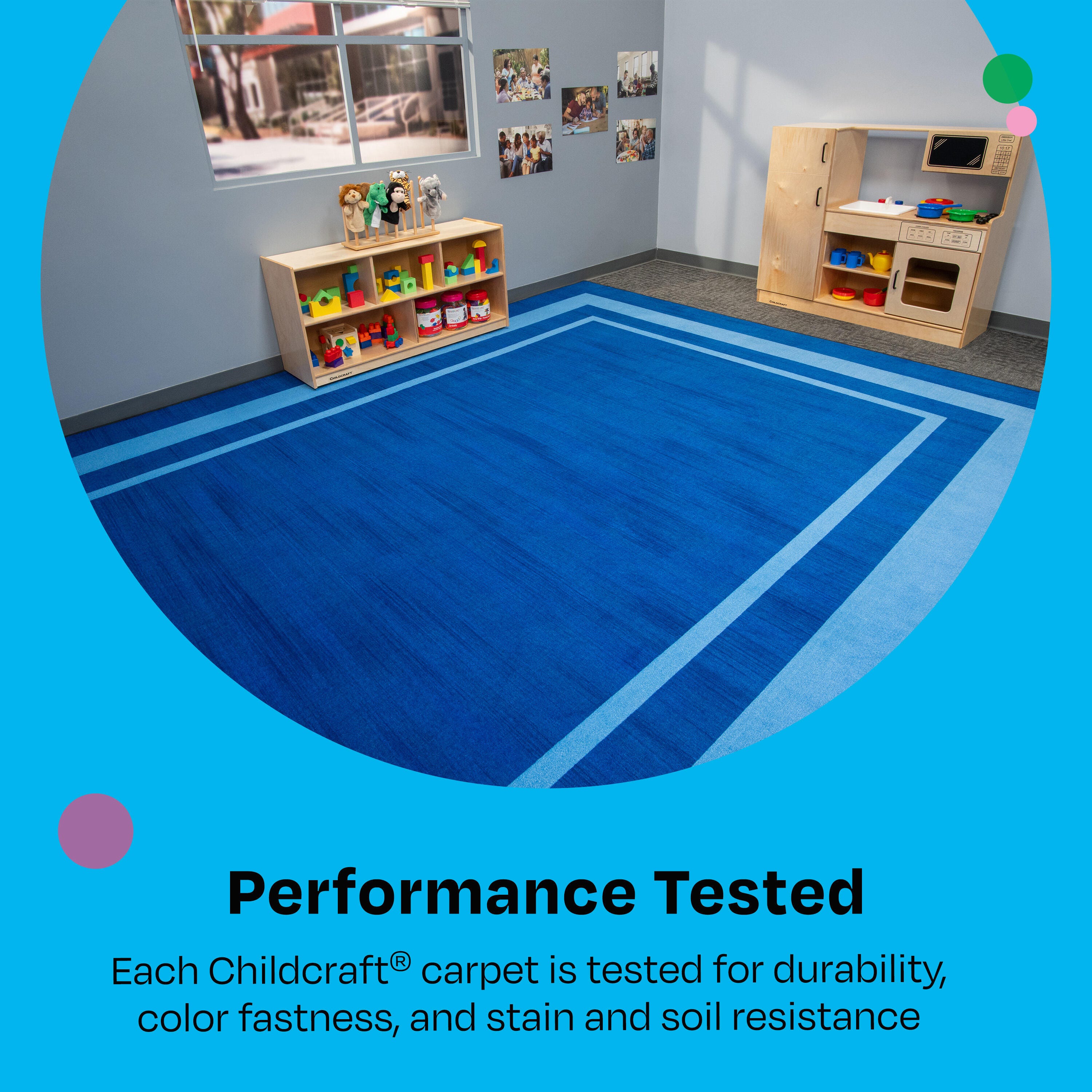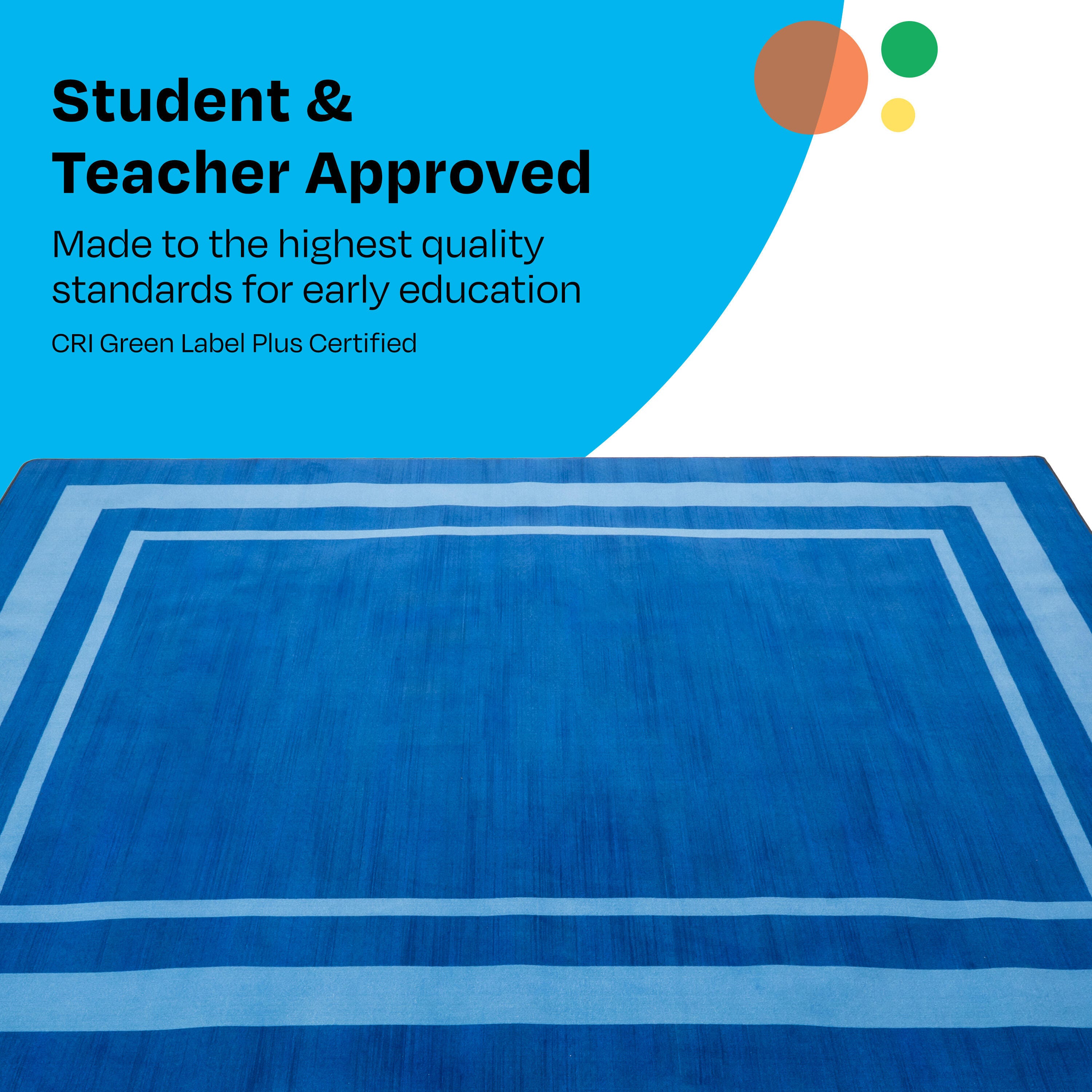 Description This Childcraft® Simple Border Carpet for Classrooms features a sleek line and colorful design. The simple yet stylish carpet suits all types of early education classrooms and childcare centers. Made of high-quality materials, the rectangle carpet is great for everyday use for reading, story time, group activities, circle time, and more. Each Childcraft® carpet is performance tested for durability, color fastness, and stain and soil resistance for quality you can trust. The Green Label Plus Certification also helps ensure the best indoor quality for a safe and healthy environment all year long.Please Note: Childcraft® carpets are custom designs that are made to order and are therefore non-returnable. Features Find the best classroom carpet for your needs; other colors and sizes available This carpet for classroom use meets or exceeds Class 1 Fire Rating Childcraft® carpets are up to 25 percent thicker and heavier than other leading educational carpets High-quality design with performance-tested materials known for their strength, stain and fade resistance, and durability Stainless Rug Protection helps permanently prevent stains on the colorful carpet and withstands professional cleaning with no need for reapplication Team up with Childcraft® to design and outfit your early education environment; we have 75+ years of experience and offer a limited lifetime warranty Committed to the 5C’s of Childcraft®: Child-safe, Crafted with quality, Constructed for durability, Complete solutions, and Cleanable design