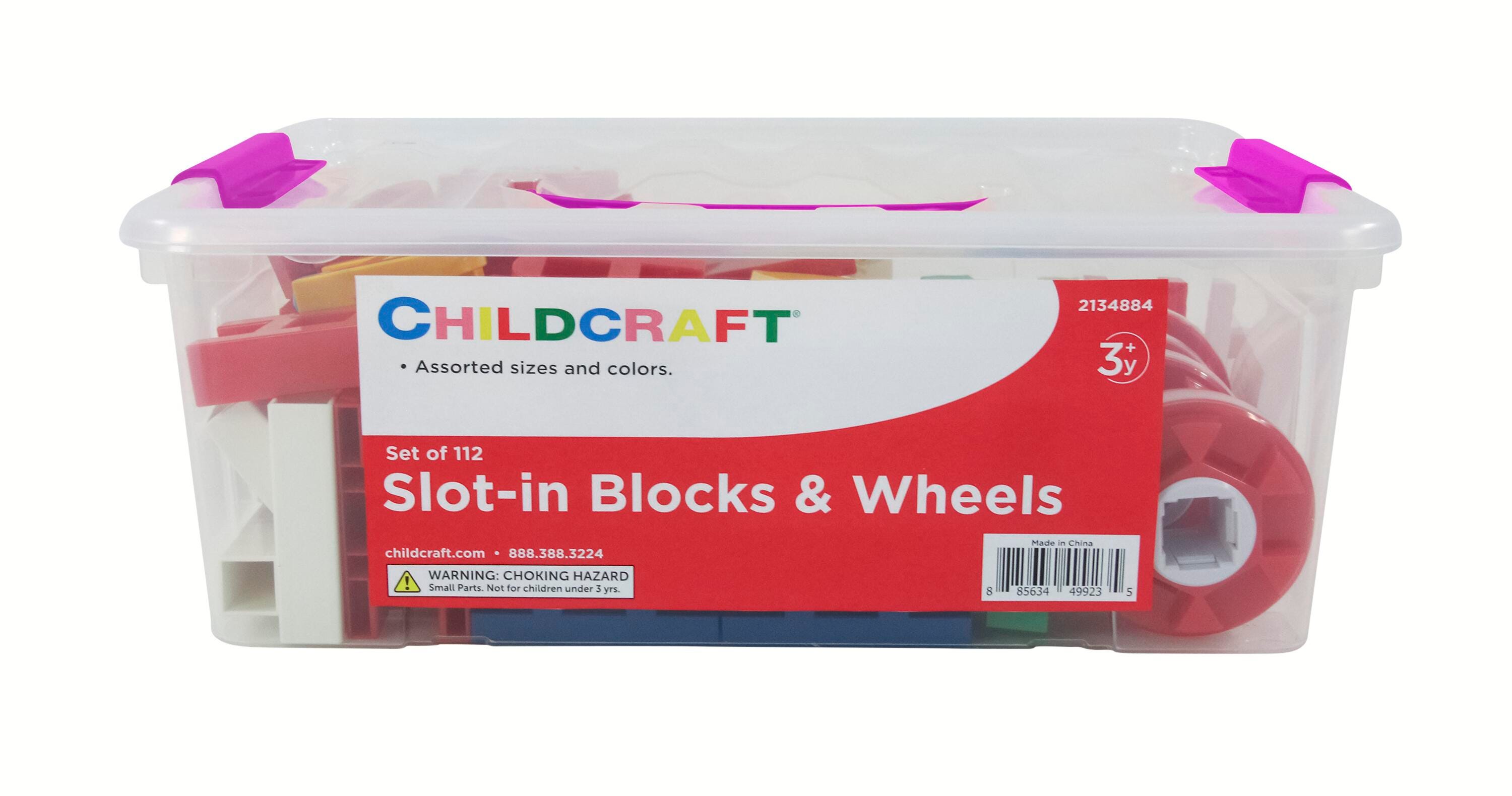 The Childcraft® Slot-In Blocks and Wheels Set is perfect for developing fine motor skills, spatial reasoning, and imaginative thinking. This 112-piece play set includes various interlocking blocks and wheels that allow children to build exciting structures, vehicles, and more. The easy-to-connect manipulatives come in bright colors and assorted shapes, making construction simple and engaging for young learners. Activity cards provide guided inspiration, while the durable storage bin keeps everything neatly organized. Ideal for classrooms, childcare centers, and home playrooms, this set ensures hours of creative, screen-free fun. Appropriate for ages 3+.Features