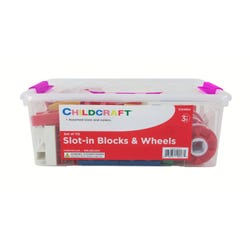 The Childcraft® Slot-In Blocks and Wheels Set is perfect for developing fine motor skills, spatial reasoning, and imaginative thinking. This 112-piece play set includes various interlocking blocks and wheels that allow children to build exciting structures, vehicles, and more. The easy-to-connect manipulatives come in bright colors and assorted shapes, making construction simple and engaging for young learners. Activity cards provide guided inspiration, while the durable storage bin keeps everything neatly organized. Ideal for classrooms, childcare centers, and home playrooms, this set ensures hours of creative, screen-free fun. Appropriate for ages 3+.Features
