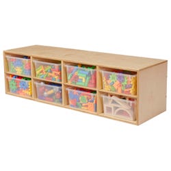 The Childcraft® Stacker Compartment Storage Unit is a versatile and space-saving solution for classrooms, playrooms, and learning spaces. This unit includes 8 translucent bins, each sized 10-3/4 W x 13-3/8 D x 5-1/4 H inches. Designed for customizable storage, this wooden shelf can be stacked up to three units high and securely fastened together with the included hardware. Partially pre-drilled holes and hook-and-loop strips allow for easy wall mounting or attachment to other 14-1/4-inch deep storage units. Constructed from durable birch plywood, this storage shelf is built to last and features a smooth, easy-to-clean finish. Comes fully assembled. Measures 46-1/4 W x 14-1/4 D x 13-3/4 H inches.Features