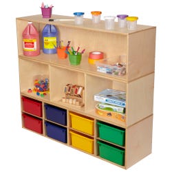The Childcraft® Stacker Compartment Storage Unit is a versatile and space-saving solution for classrooms, playrooms, and learning spaces. This unit includes 8 colorful bins, each sized 10-3/4 W x 13-3/8 D x 5-1/4 H inches. Designed for customizable storage, this wooden shelf can be stacked up to three units high and securely fastened together with the included hardware. Partially pre-drilled holes and hook-and-loop strips allow for easy wall mounting or attachment to other 14-1/4-inch deep storage units. Constructed from durable birch plywood, this storage shelf is built to last and features a smooth, easy-to-clean finish. Comes fully assembled. Measures 46-1/4 W x 14-1/4 D x 13-3/4 H inches.Features