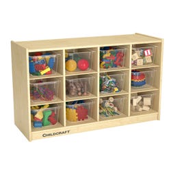 The Childcraft® Mobile Cubby Storage Unit with 12 clear trays provides ample space for organizing books, supplies, and more in classrooms, childcare centers, and home learning environments. Each plastic bin measures 7-3/4 W x 12 D x 5-1/4 H inches to keep items neatly contained. Removable shelves allow for customizable storage options and easy cleaning, while the concealed heavy-duty caster wheels provide effortless mobility around the room. Crafted from durable birch plywood with a beautiful natural veneer finish, this cubby cabinet is built to last. Measures 38-3/8 W x 14-1/4 D x 24 H inches. Comes fully assembled.Features