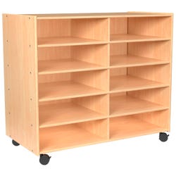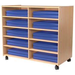 Childcraft® Universal Rest Mat Storage Unit provides a versatile and efficient solution for storing and transporting rest mats in classrooms, daycare centers, and nap areas. Designed to accommodate 3-fold and 4-fold rest mats as well as 1-inch and 2-inch thick mats, this classroom cart on wheels ensures a tidy and clutter-free space. The sturdy wooden construction features spacious shelves that allow for additional storage of small blankets or sheets. Four heavy-duty locking caster wheels provide smooth mobility while keeping the storage cart secure when stationary. The fully assembled unit measures 47-3/4 W x 24-3/4 D x 42 H inches, and each shelf space measures 22-5/16 W x 24 D x 6-7/8 H inches.Features
