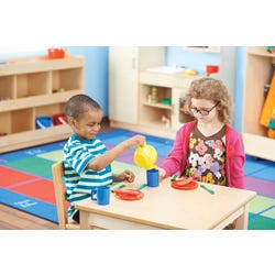 This Childcraft® Wood Table is a sturdy and space-saving solution for group activities, lessons, and play. Designed for early learning environments, the durable table features a smooth woodgrain laminate top that resists stains and is easy to clean—ideal for art projects with paint or crayons. Constructed with a solid maple apron and legs, plus birch veneer panels, this classroom table offers a sturdy design. The low height makes it a great fit for a variety of age groups and uses. Measures 30 W x 30 D x 26 H inches. Simple leg assembly required.Features