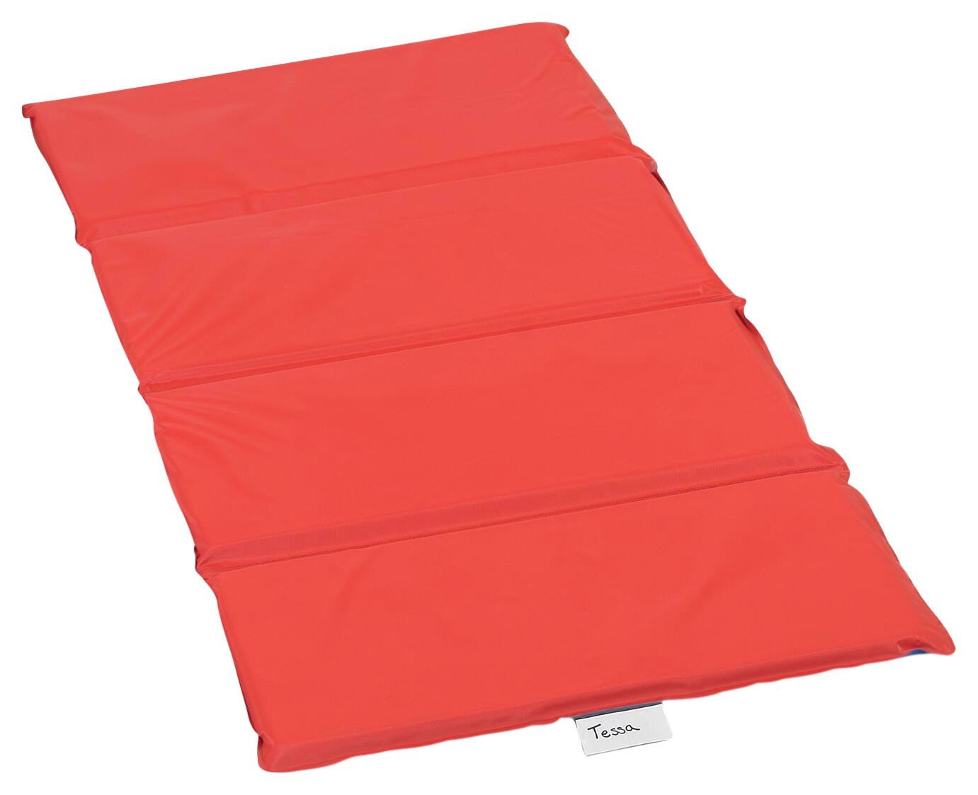 Mats are completely sealed using radio-frequency technology in order to resist bacteria and germs. Waterproof seals between foam sections and around all edges provide total protection from liquid and bacteria contamination. Easy-to-clean, durable vinyl cover has a dual-color combination to easily assign sleeping and floor sides. Mats can be used in a variety of spaces and folds easily to 13 L x 24 W x 4-1/4 H inches for convenient storage.Features