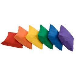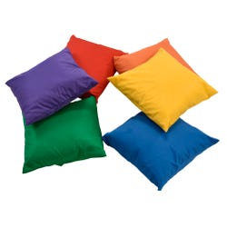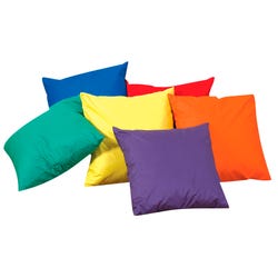 Find a rainbow of comfort in these vibrant and versatile pillows that can be used as floor cushions or supported seating. These soft pillows are in vibrant primary colors, perfect for early color identification and made high-contrast for easy visibility. Pillows are filled with polyester fiber and have removable washable and dryable polyester covers. Measures 12 L x 12 W inches, with a thickness of 4 inches.Features
