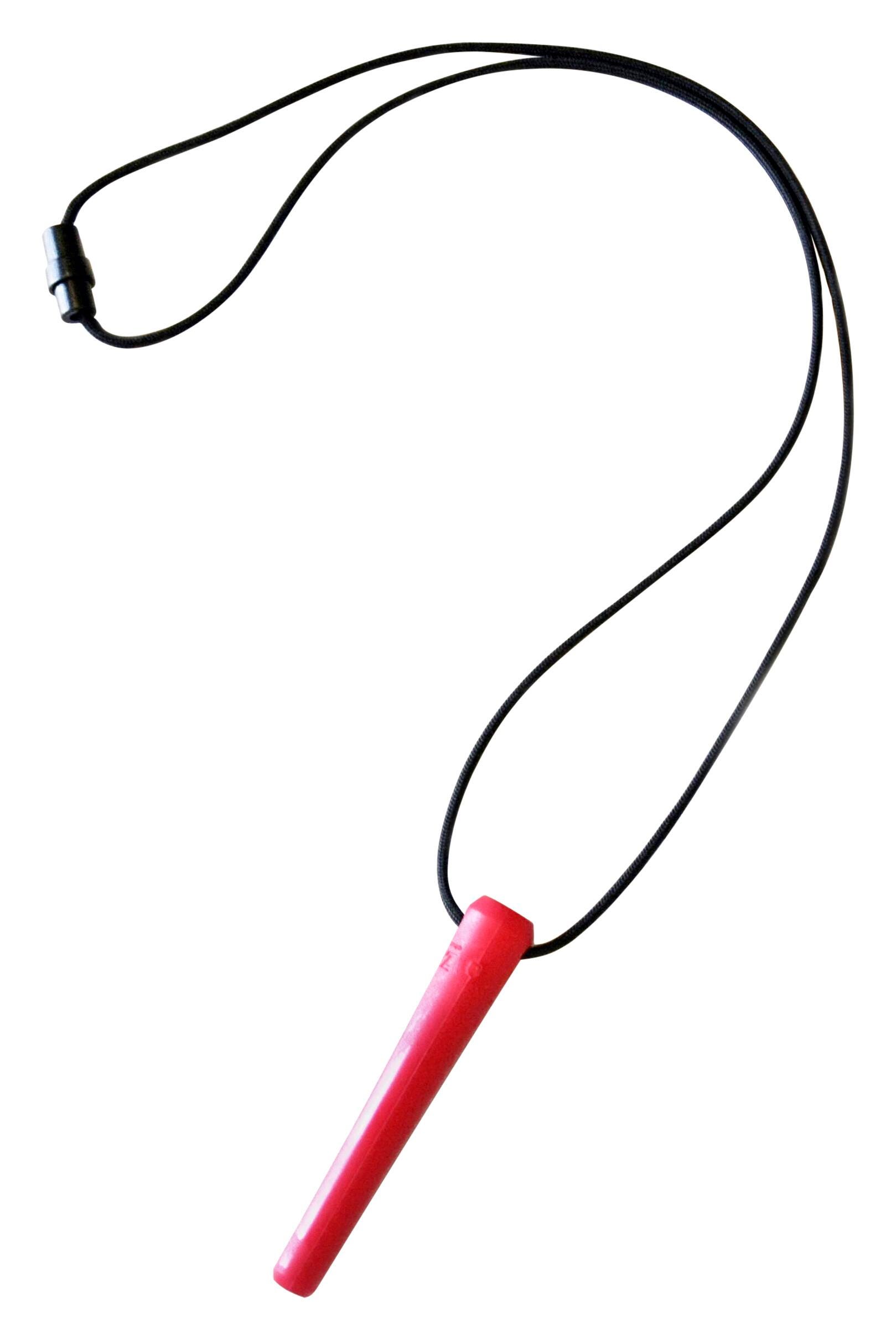 The red ChuBuddy Smooth Tube Zilla has a smooth texture and a tapered end. Zilla products are super strong and 70A durometer. The Smooth Tube Zilla comes on a black paracord breakaway lanyard for convenience and ease of use. Zilla means that these chews are super strong yet they are 70A durometer which is soft.Features