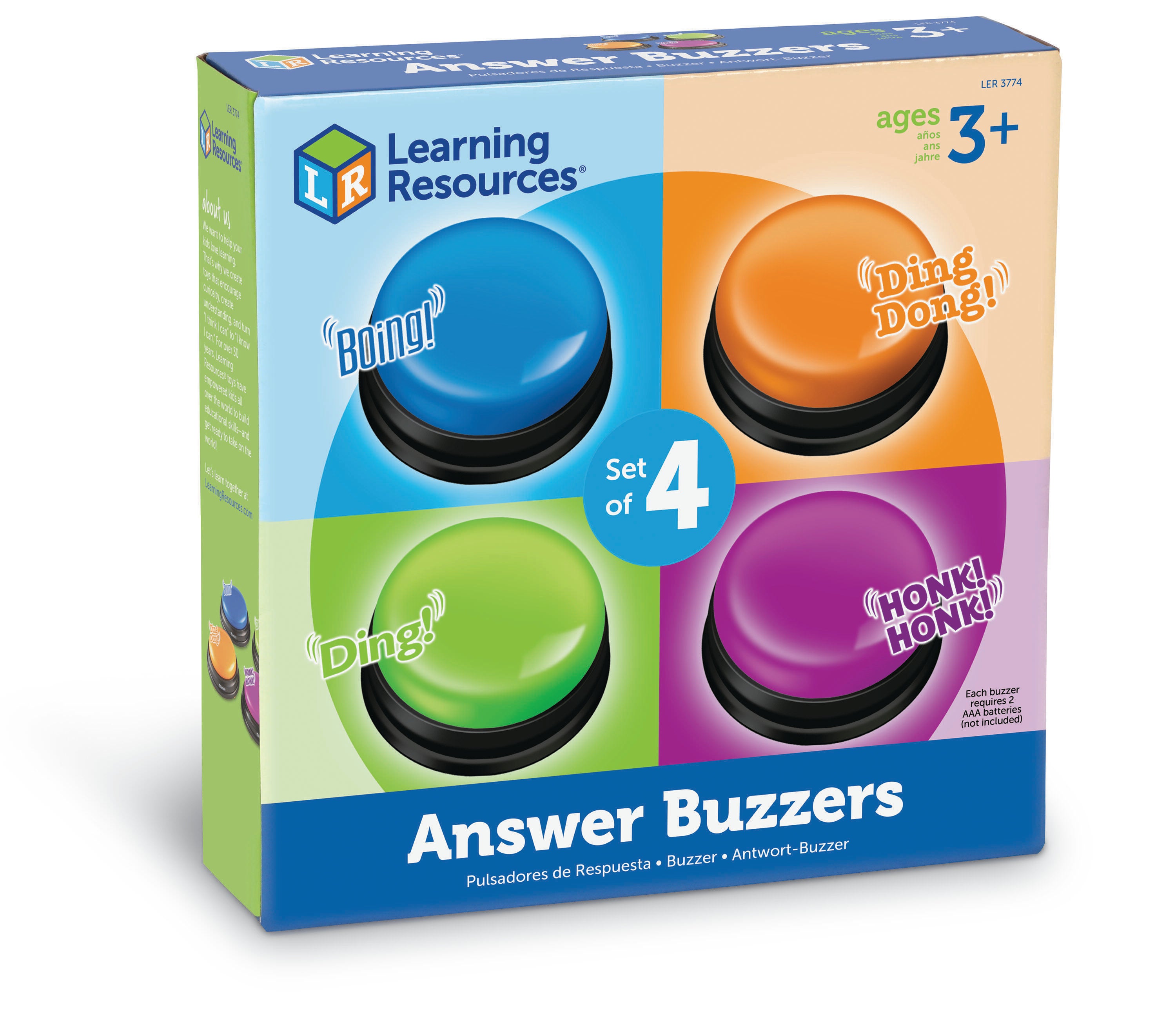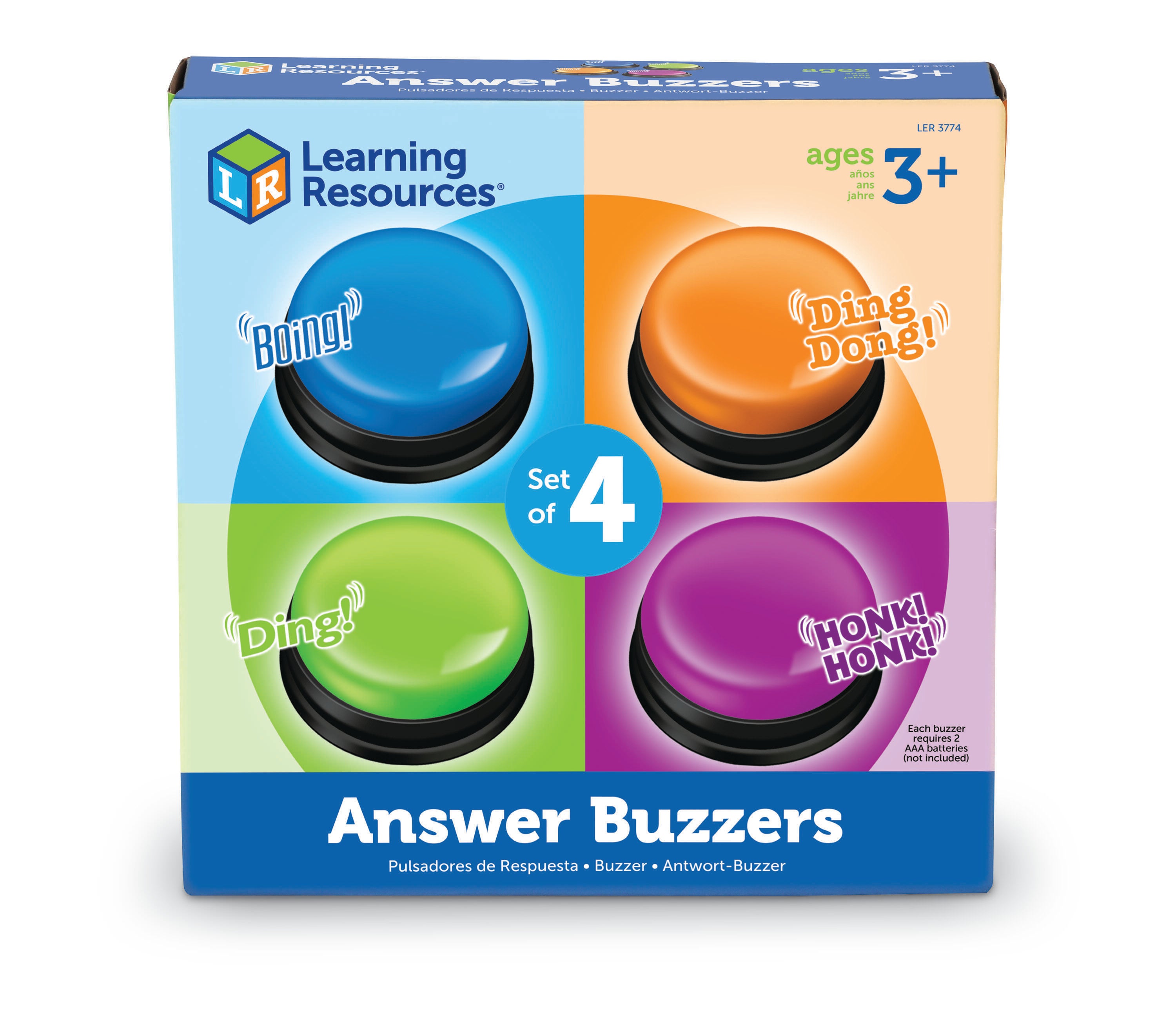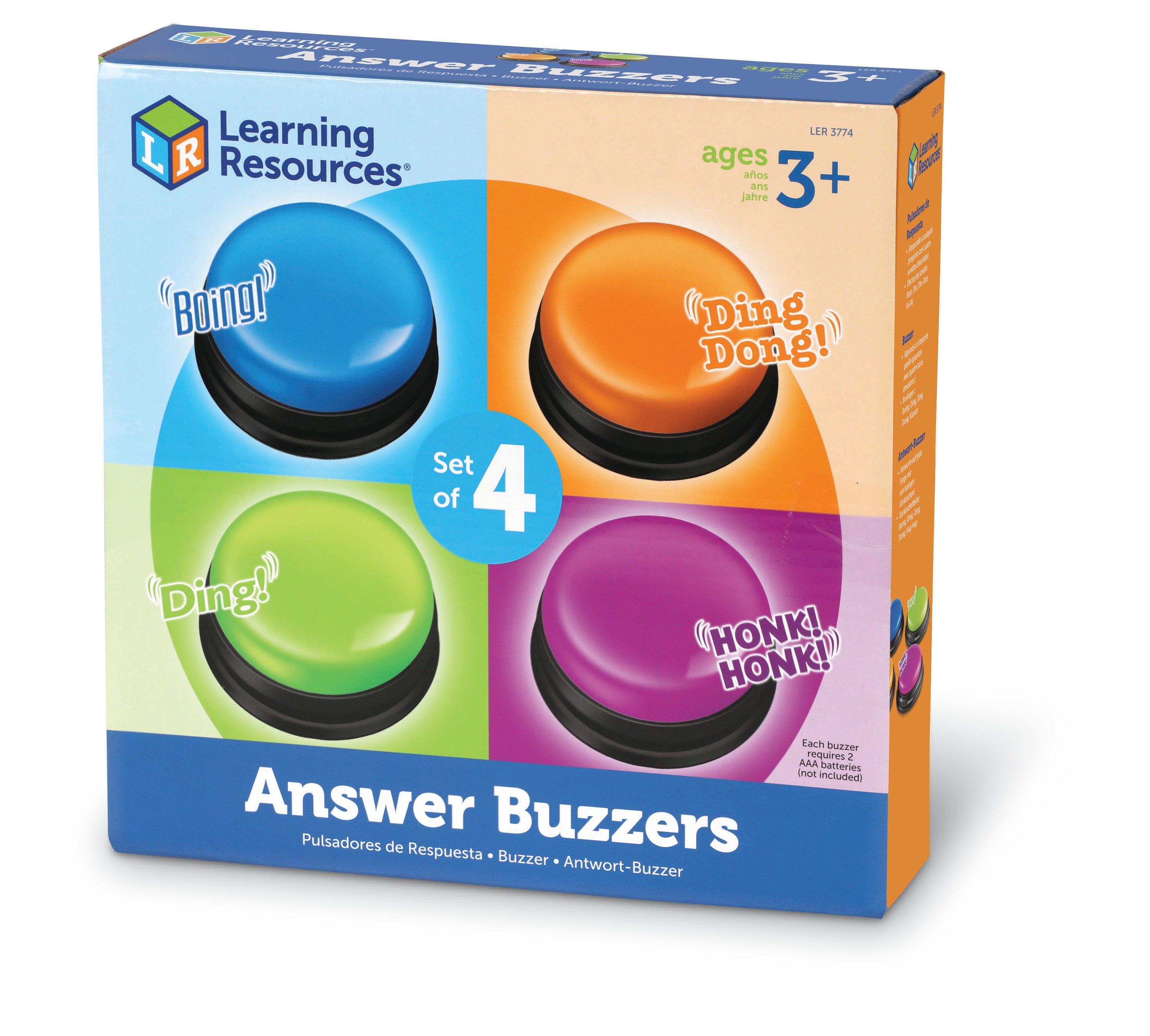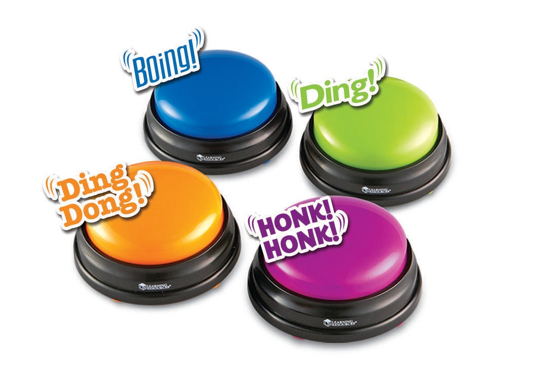 Get students actively engaged as you assess them! Game-show buzzers turn any lesson into a game. Four different colors and fun sound horn honk, boxing bell, doorbell, and boing. Each buzzer has a diameter of 3-1/2 inches and requires 2 AAA batteries, not included. Created for ages 3 and up. Sold as a set of 4.