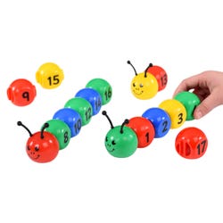 Educational Advantage Number Bugs 1-20 slot together easily to create multi-colored number bugs. The plastic body segments have numbers on one side and are blank on the reverse side to enable teachers and children to hide numbers to identify the sequence or what number is missing. The heads are 2 in H (to top of antennae) x 1-1/2 in W. The body segment is 1-2/5 in L x 1-2/5 in W. Set of 24 includes 4 bug heads and 20 numbered body segments. Ideal for developing fine motor skills, sorting and counting, and numeracy. Ages 3 and Above.