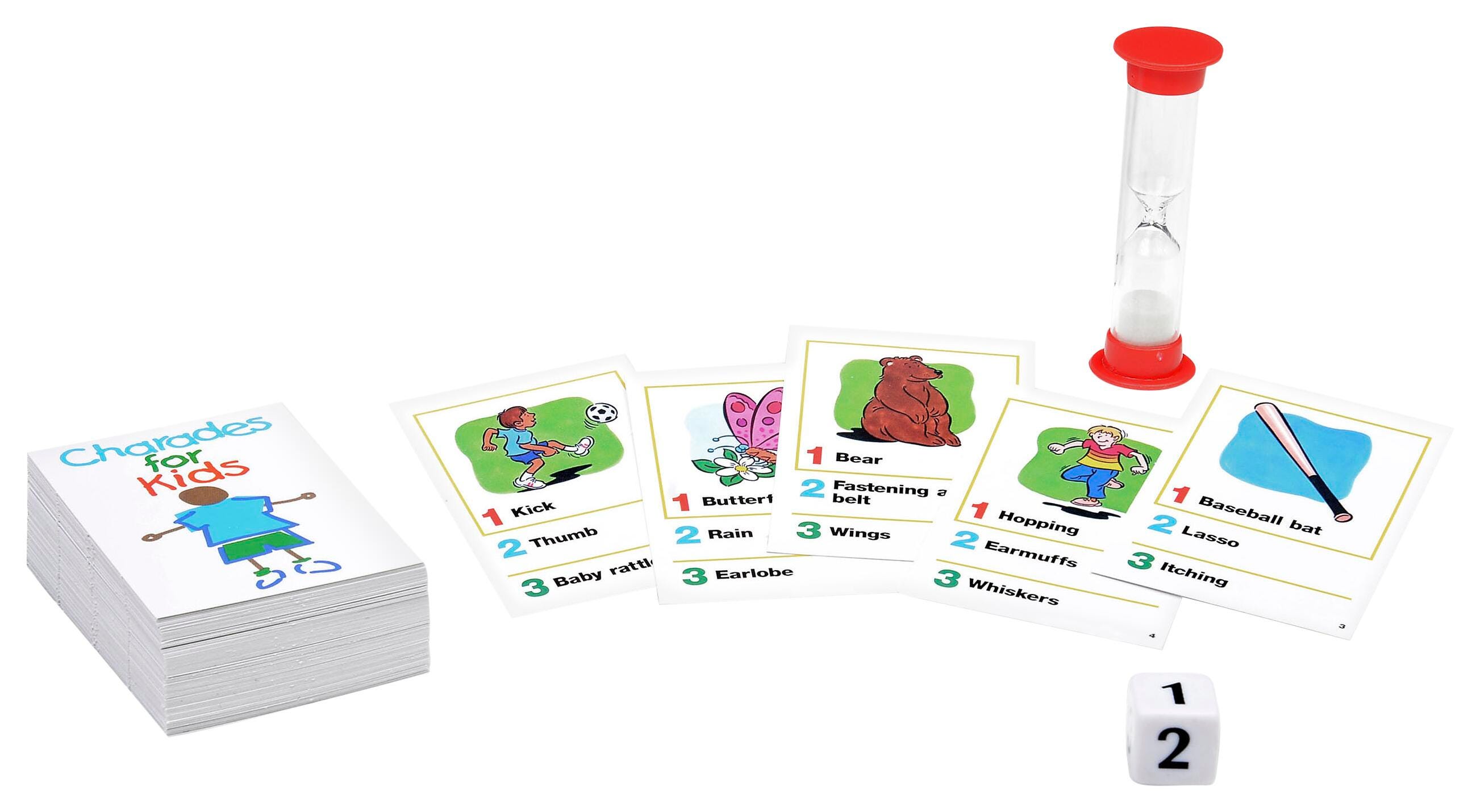 The classic game of Charades - now designed especially for kids to play and enjoy! With three levels of clues, each card has one pictured clue, so no reading is required (although the combination of the picture and its corresponding word reinforces early reading skills). Younger players can act out a toothbrush, a cat or a bumblebee. Older children can read the simple words and phrases and act out actions like eating spaghetti or playing guitar! It's great fun for the whole family as they try to guess the charade before time runs out! For 3 or more players, ages 4 and up.Features