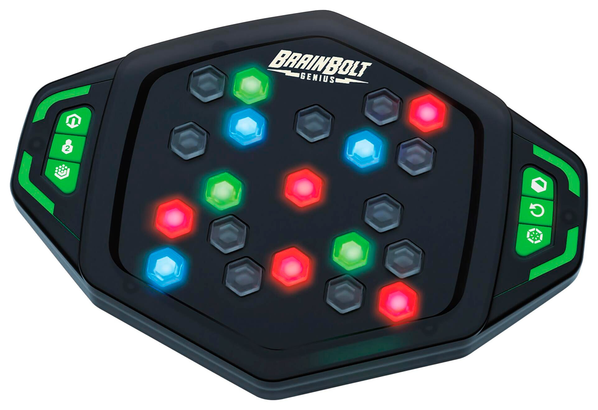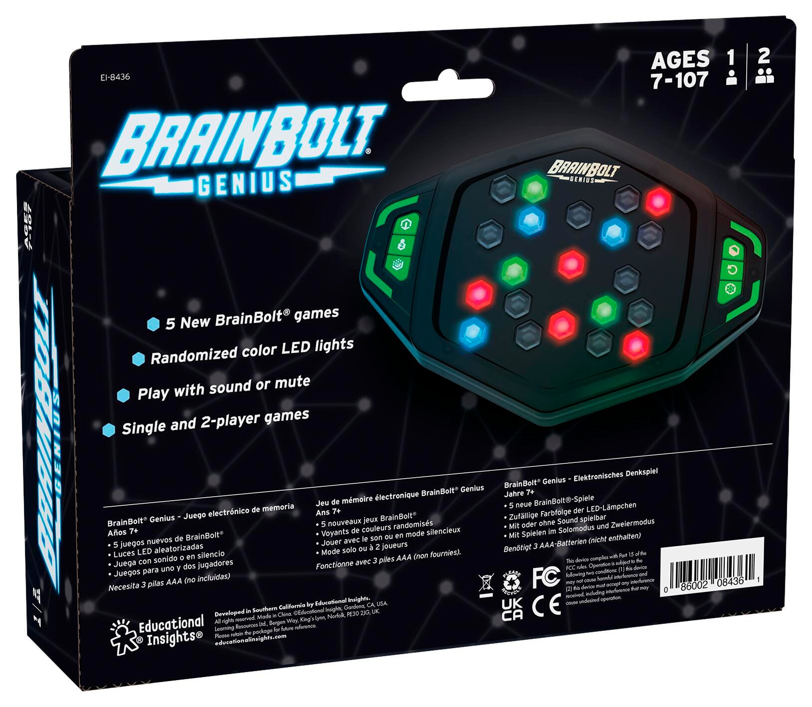 The BrainBolt® Genius from Educational Insights is a handheld game designed to supercharge your memory! Watch as up to 21 colored lights flash at random, then challenge yourself to repeat the patterns without missing a beat. Five new genius levels, randomized patterns, and solo or head-to-head modes make this portable hand-held brainbender the perfect way to play; at home, in the classroom, or on the go! It's addictive, puzzle-playing fun for players of all ages.Features