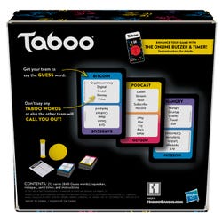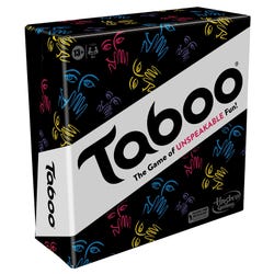 Taboo is the game of unspeakable fun! Can you get your team to say Brain Freeze? What if you can't say Ice Cream, Headache, Eating, Cold or Fast? When you play Taboo, the obvious clues are strictly taboo! You have to give creative, carefully worded clues to get your team to guess words fast. But don't mention unmentionables, or you'll get the squeaker and lose the point.Features