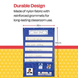 Put key lessons on display with the School Smart sentence strip pocket chart. This chart makes posting word and grammar examples, and directions clear and easy to see. The large nylon fabric design features 6 clear-view horizontal slip pockets (one largest at top for inserting in title or objective) and 4 ample pouches near the bottom for adding in graphic examples. This pocket chart can also store extra cards or school supplies. Durable metal grommets at the top allow you to easily hang the chart from a curtain pole, bulletin board, and more. The full pocket chart measures 44-1/2 L x 28 W inches.Features