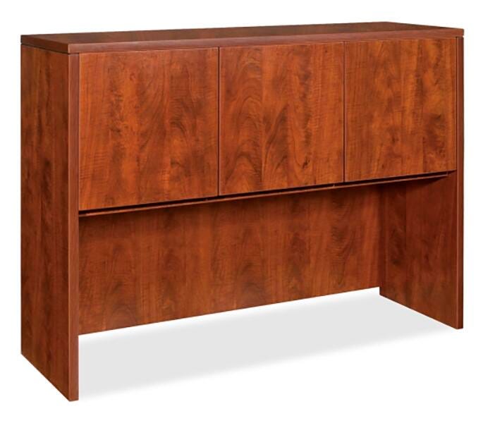 This hutch with doors offers a high-quality, cherry laminate construction with metal-to-metal, cam-lock connections. The design includes 3-millimeter PVC edges and adjustable floor guides for stabilization. This unit has predrilled holes with metal inserts for easy attachment by screws of pedestals. The brackets are designed for L-shaped configurations and bridge returns. Unit has a durable 1 inch thick laminate top.Features