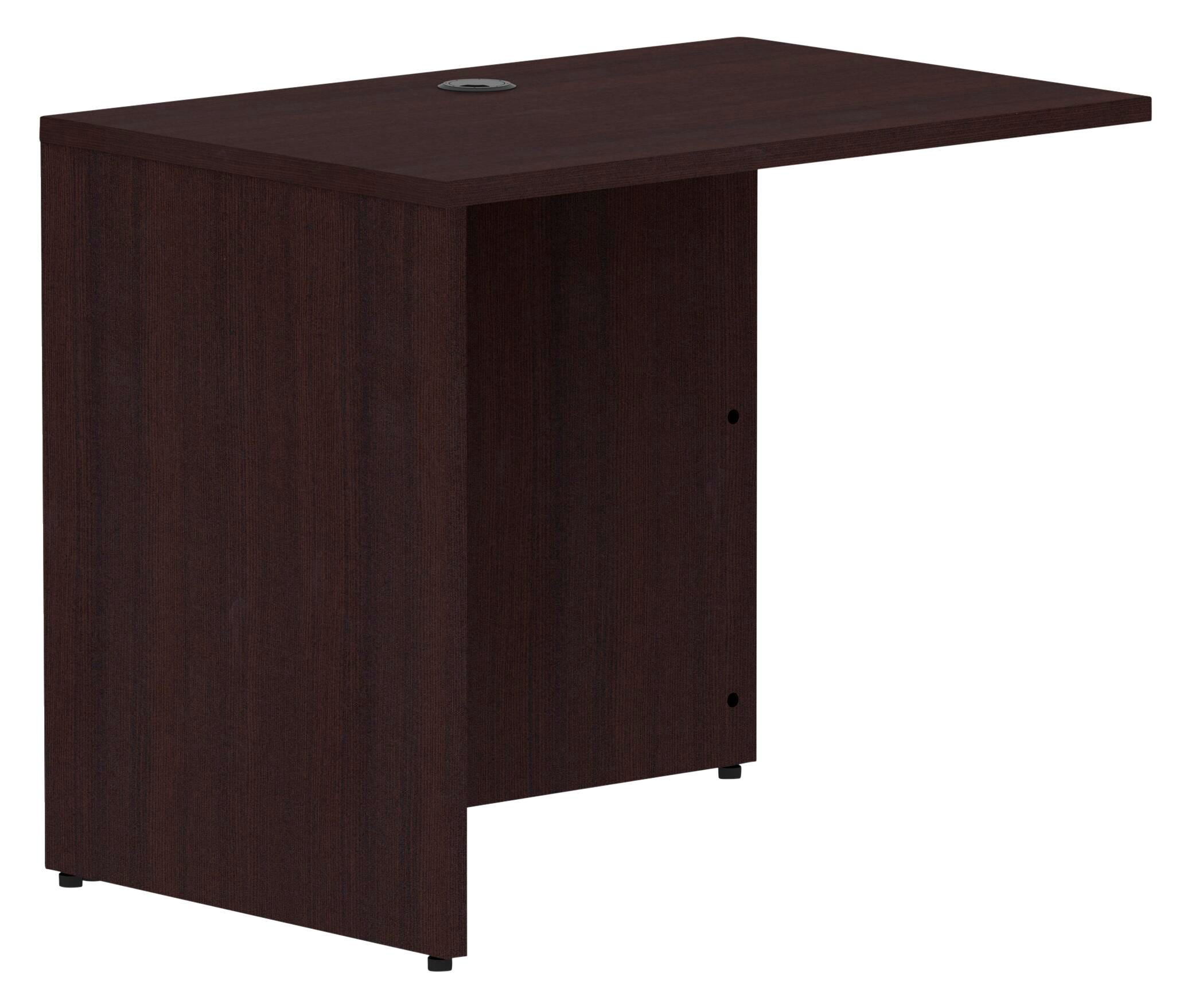 Office furniture offers a high quality, espresso laminate construction with metal to metal, camlock connections. Design includes 3mm PVC edges and adjustable floor guides for stabilization. Furniture has predrilled holes with metal inserts for easy attachment. Brackets are designed for L shaped configurations and bridge returns. Unit has a durable 1 inch thick laminate top.