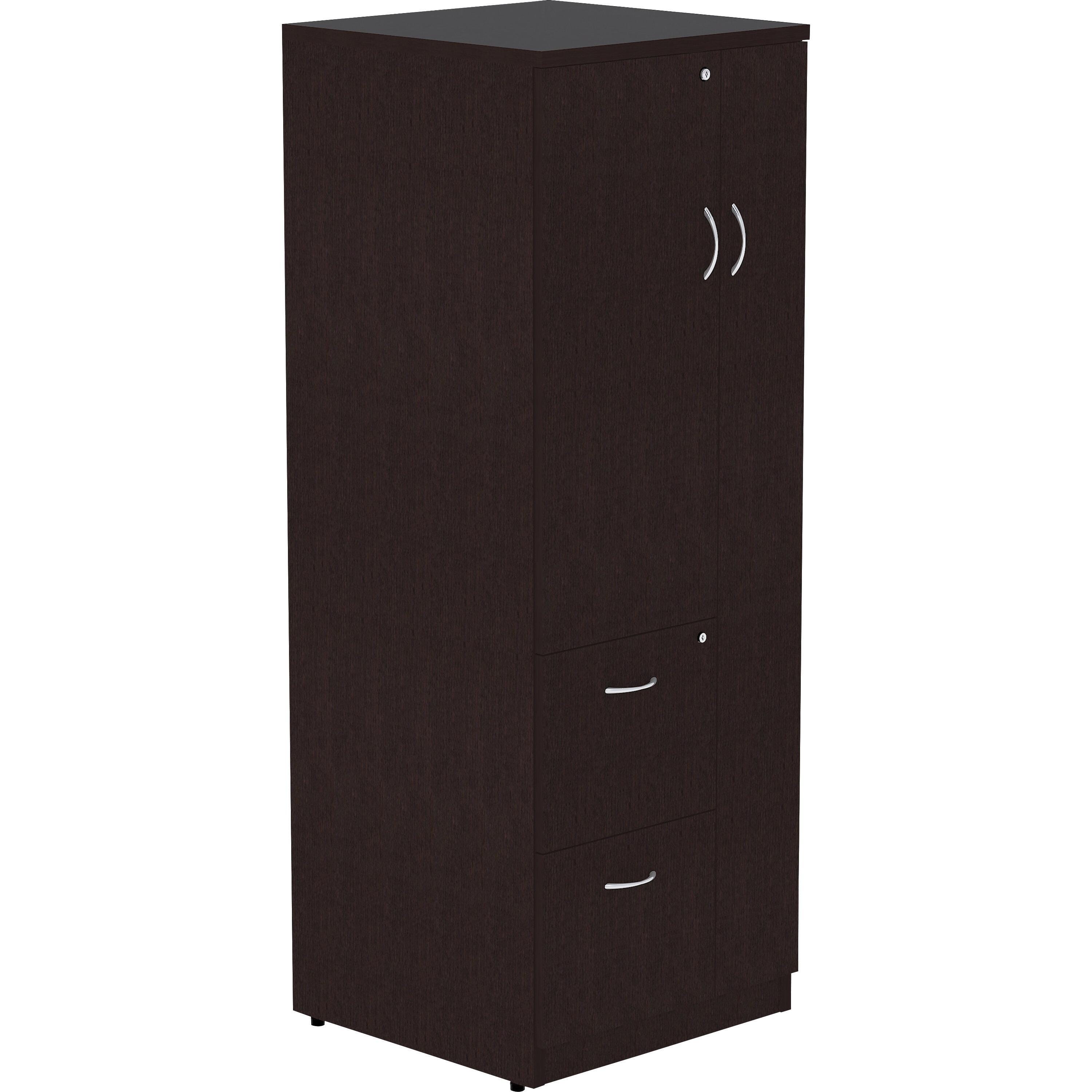 Tall storage cabinet can be used with Lorell Essentials or Relevance Series with high-quality laminate construction and metal-to-metal, cam-lock connections. Design of the cabinet expands your storage opportunities with the varied sizes of compartments. Full-length compartment on the right features a door to conceal contents. On the left, the half-length compartment includes a locking door and two shelves. Bottom two drawers lock to secure your belongings and hold letter-size files. Durable, Espresso laminate surfaces provide a professional look and are abrasion-resistant. Back is finished on both sides. Cabinet is made of particleboard and medium-density fiberboard. Adjustable levelers help stabilize the cabinet on uneven surfaces.Features