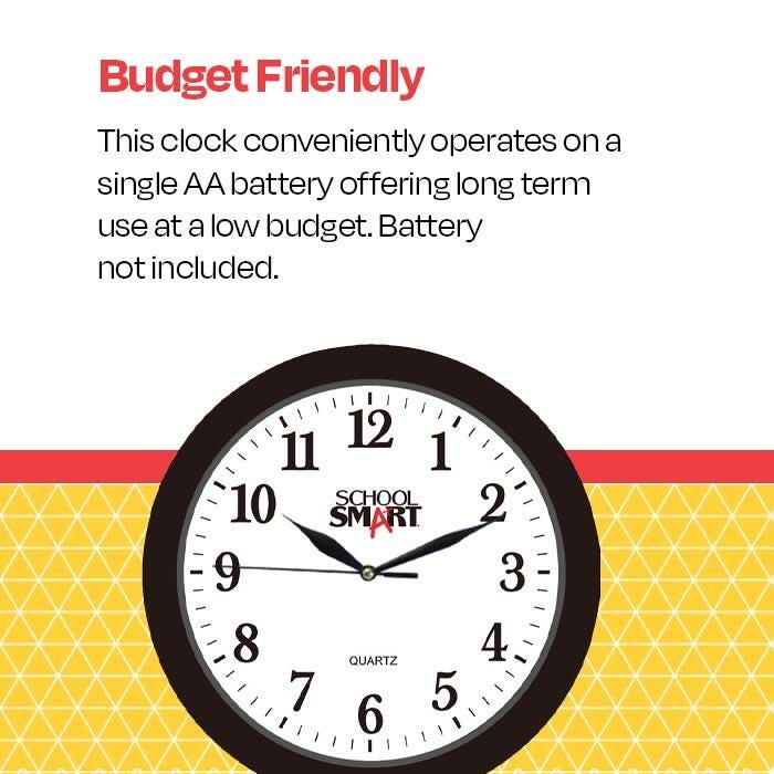 Keep track of your day with the Black Wall Clock from School Smart! This visual timekeeper measures 10 x 10 x 1.25 inches and makes a perfect addition to any room. Featuring a large, easy-to-read white dial and contrasting black frame, the silent movement sweep of the second-hand makes this a subtle addition to your space. The sleek design with a clear glass lens gives you an optimal line of sight to the minute. Perfect for quiet areas, such as libraries, reception areas, and offices. It works on a single AA battery (battery sold separately).