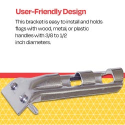 Hanging up your flag is simplified with the flag bracket from School Smart. This flag bracket measures 4-1/4 L x 2 W x 1/4 Diameter inches and can hold wood, metal, or plastic staffs from 3/8 to 1/2 inch diameter. This economical bracket is made with sturdy steel construction and is designed for indoor use. Suitable for the classroom or offices. Simple assembly required.Features