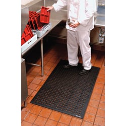 Comfort Flow is a flow-through mat with excellent anti-fatigue properties designed for wet areas where grease, oil, and chemicals may be present. Drainage holes allow liquid to flow through; lifetime anti-microbial treatment prevents odors and degradation of the mat. Beveled edges provide a safe transition from floor to mat; certified high-traction by the National Floor Safety Institute (NFSI). High-density closed-cell nitrile rubber foam provides excellent anti-fatigue qualities. Grease and oil proof; chemical resistant; welding safe. Lightweight flexible design ensures easy handling and cleaning and is commercially launderable. Dimensions of mat: 3 W x 5 H ft.Features