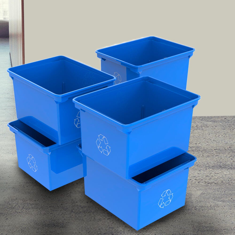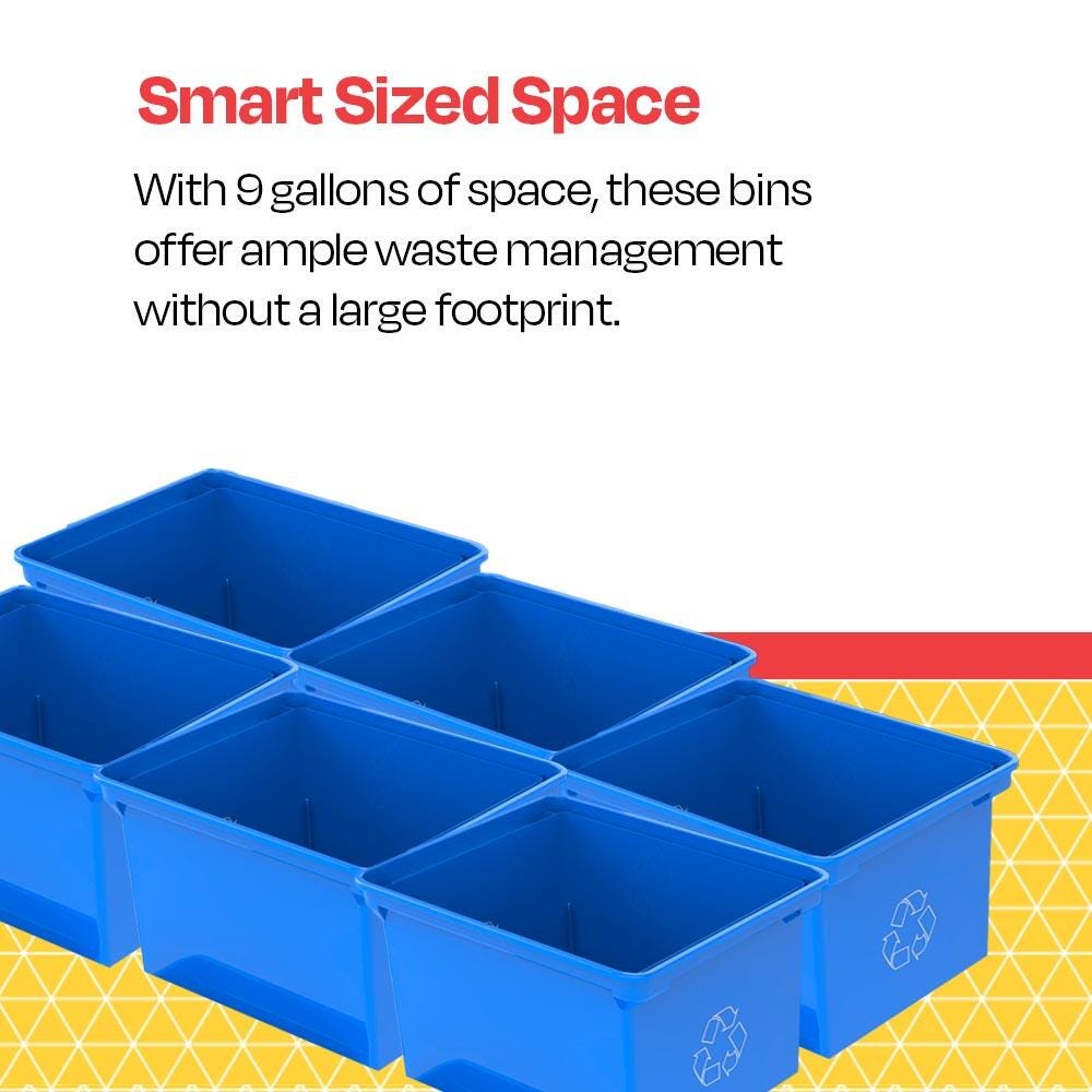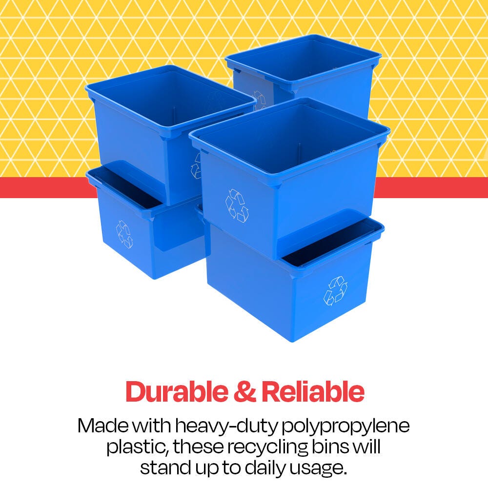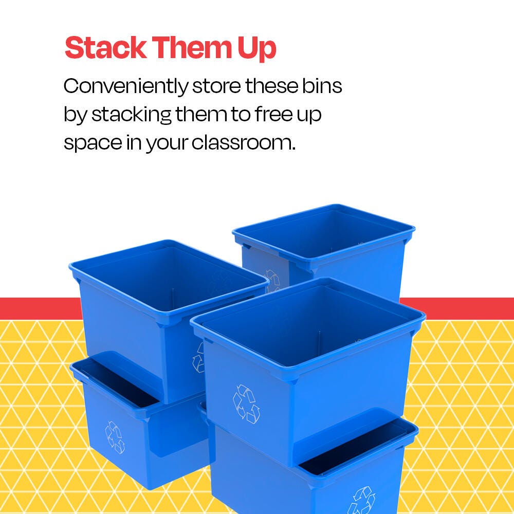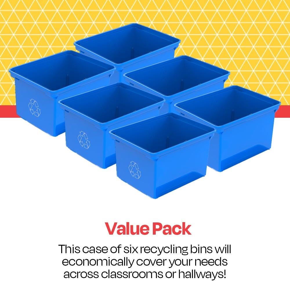 These Recycling Bins from School Smart are built from heavy-duty polypropylene for durability and reliability in schools, offices, or homes. The handy bins provide a simple way to sort and dispose of recycling waste and built-in handles provide a firm grip when transporting the bin. Their stackable design allows for easy storage and shipping. The XL 9-gallon (35 liters) bins provide ample room for all paper and other recycling. This case comes with 6 blue recycling bins.