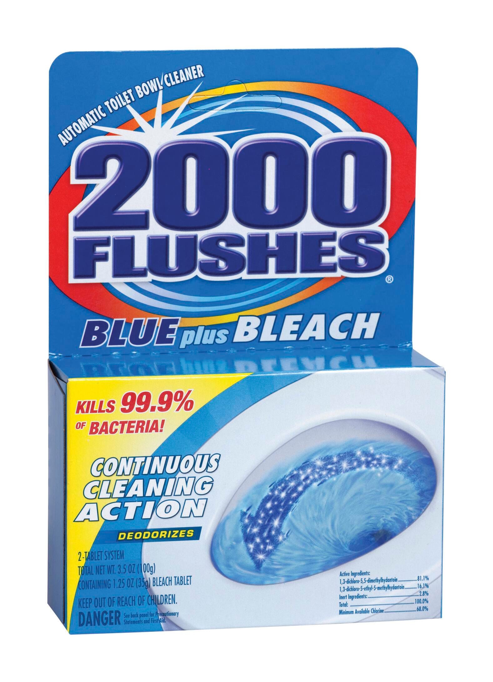 Keep your toilet clean, fresh, and sanitary with 2000 Flushes Blue Plus Bleach Bowl Cleaner Tablets. These long-lasting tablets provide continuous cleaning action for up to four months, fighting stains, bacteria, and odors with every flush. The concentrated formula kills 99.9% of bacteria and uses powerful chlorine to bleach away tough stains, keeping your toilet bowl crystal-clear, deodorized, and hygienic. Safe for plumbing and septic systems when used as directed, 2000 Flushes ensures a sparkling, fresh toilet with minimal effort.Features