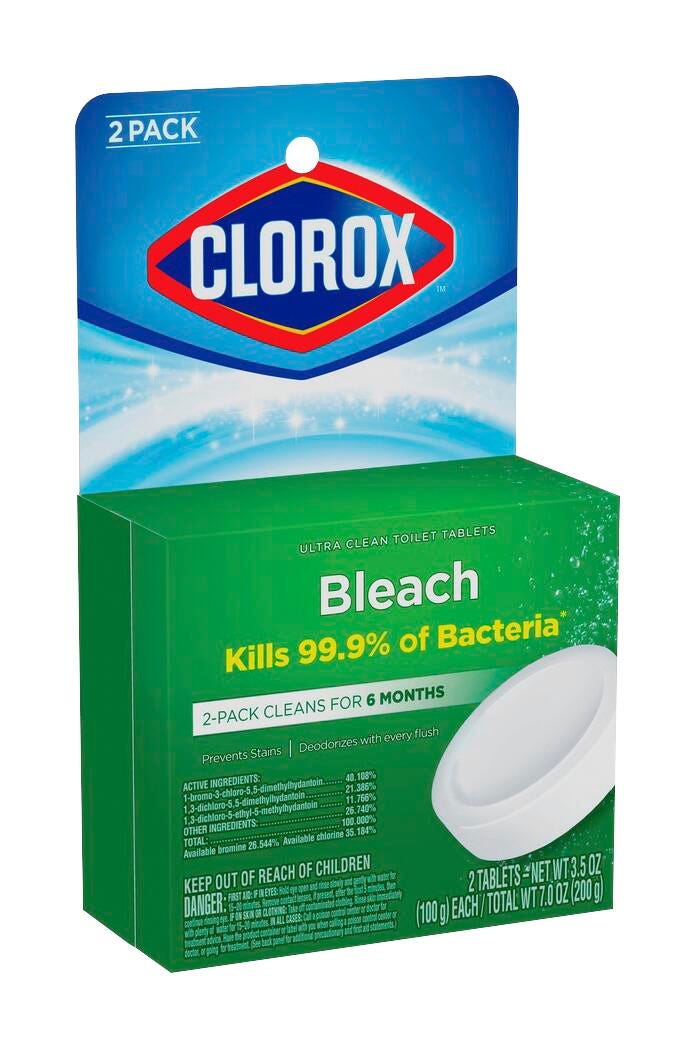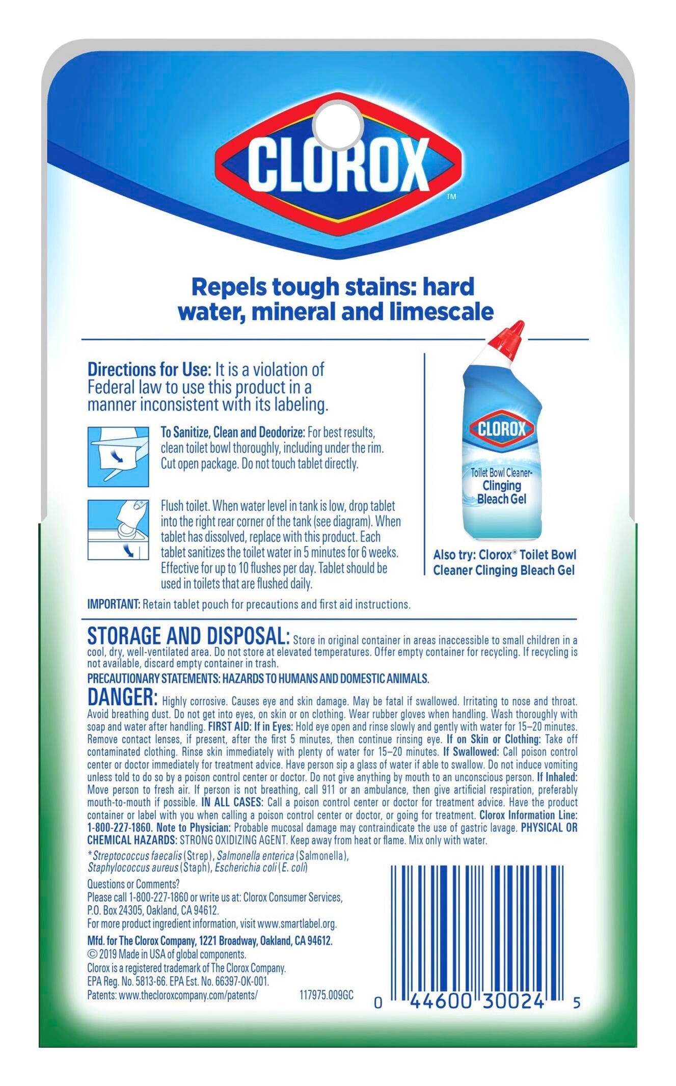 Clorox Automatic Toilet Bowl Cleaner cleans and deodorizes your toilet with the power of Clorox bleach. The easy-to-use tablets contain concentrated Clorox bleach to kill 99.9 percent of household bacteria with every flush. Each tablet delivers long-lasting clean for up to three months and repels tough stains like hard water, mineral and limescale. Drop a tablet in the rear right corner of your tank to sanitize, deodorize and clean your toilet. Tablets help keep your toilet bowl water crystal-clear and smelling fresh and help extend the time between deep cleans. They are ideal for use in offices and other commercial facilities. Case of 6.Features