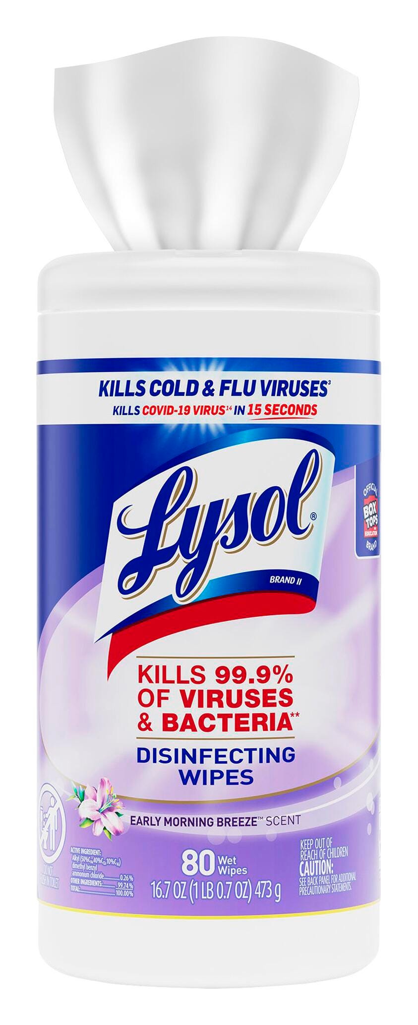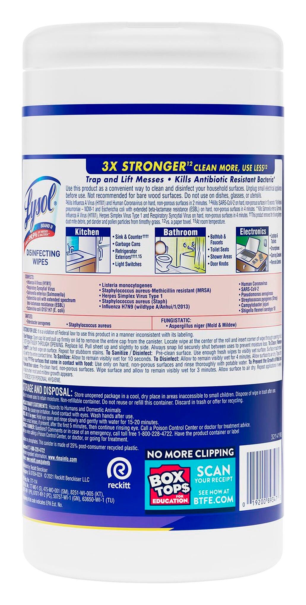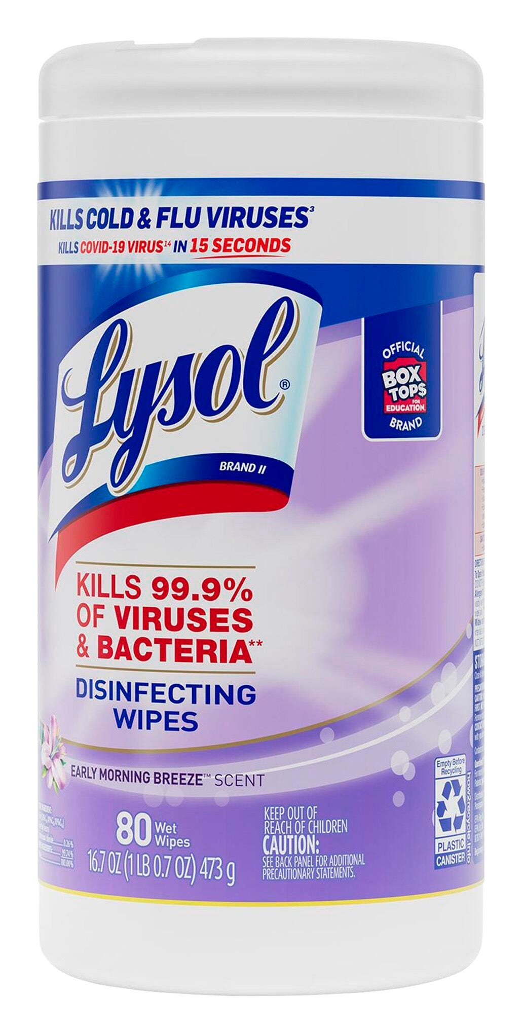Early Morning Breeze Lysol Disinfecting Wipes kill 99.9 percent of viruses and bacteria on hard, nonporous surfaces when used as directed. Thick, pre-moistened wipes with an early morning breeze scent are designed to disinfect and deodorize kitchen counters, appliances, stovetops, cabinets, floors, garbage cans, toilet exteriors, bathtubs, sinks and more. Wipes come in a convenient pop-up canister for simple, immediate use. Sold as 80 wipes.