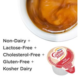 Coffee mate Original liquid creamer singles is a rich and delicious non-dairy creamer that delivers a consistently perfect cup. No refrigeration is necessary. Lactose Free, Gluten Free. One serving is 0.38 ounces each.