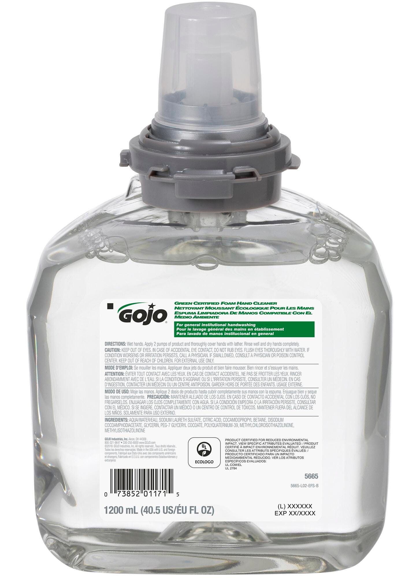GOJO TFX Green Seal Foam Handwash in a 1200 ml refill is suitable for the touch free dispensers. Sanitary-sealed collapsible bottle refill provides fresh dispensing valve.Features