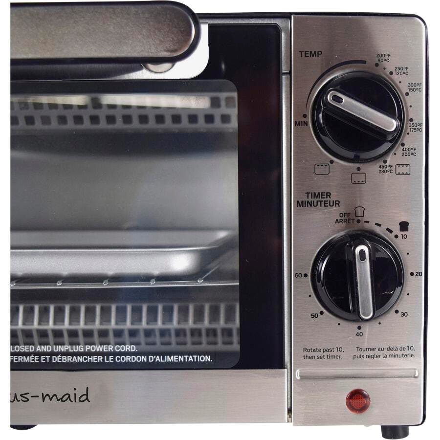 Toast, bake, and broil with the versatility of this Toaster Oven from RDI. It offers a wide temperature range and easy-to-use dial controls, including a 60-minute timer with light indicator to ensure precise cooking results. This ETL certified toaster oven also features a chrome slide-out rack, aluminum baking pan to ensure a perfect fit, crumb tray for easier cleaning, and a two-prong 2-1/2 foot cord.Features