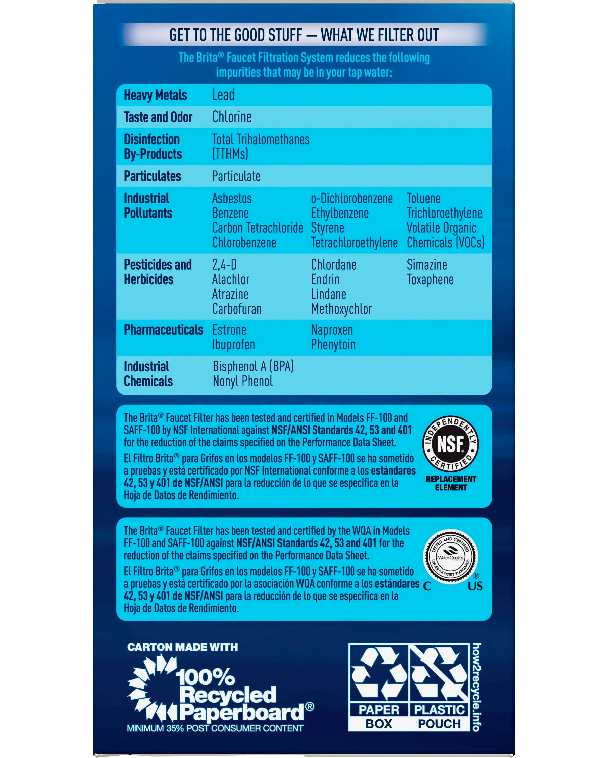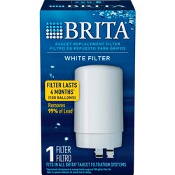 Faucet filter replacement cartridge features a long-lasting design to stay effective for up to four months or 100 gallons of water. One-click replacement snaps on with just a single click for simple installation. Filter is perfect for filtering out odors and impurities in tap water, including asbestos, chlorine, lead, benzene and trichloroethylene. BPA-free filter is designed to fit all models of Brita Basic and Advanced faucet filtration systems (sold separately).