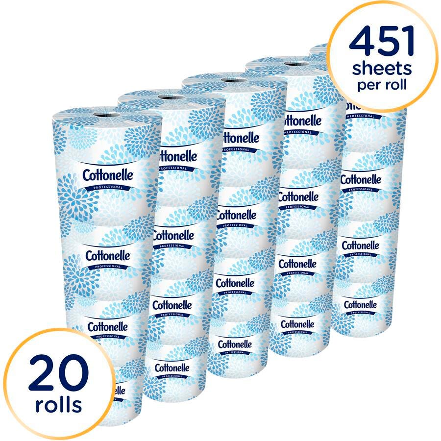 Cottonelle 2-Ply Bathroom White Tissue provides the softness plus quality of at home. It comes with easy to handle package design featuring zip-off top and space-saver packaging for easy opening and storage. Tissue made from post consumer materials with 20% recycled content. Tissue roll of 451 sheets is sold as 20 per pack. Each roll measures 4 in W X 4-1/2 in L. White.Features