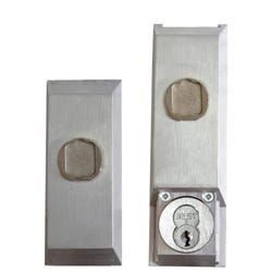 The first Guardplate to completely conceal the cylinder & keyhole, this cylinder protector installs over existing rim or mortise locks or exit devices and comes with 2 keys. Its sleek profile cannot be opened by ordinary magnets and shields the cylinder from attack by vandalism or picking. Clear aluminum finish, no wiring or batteries required.