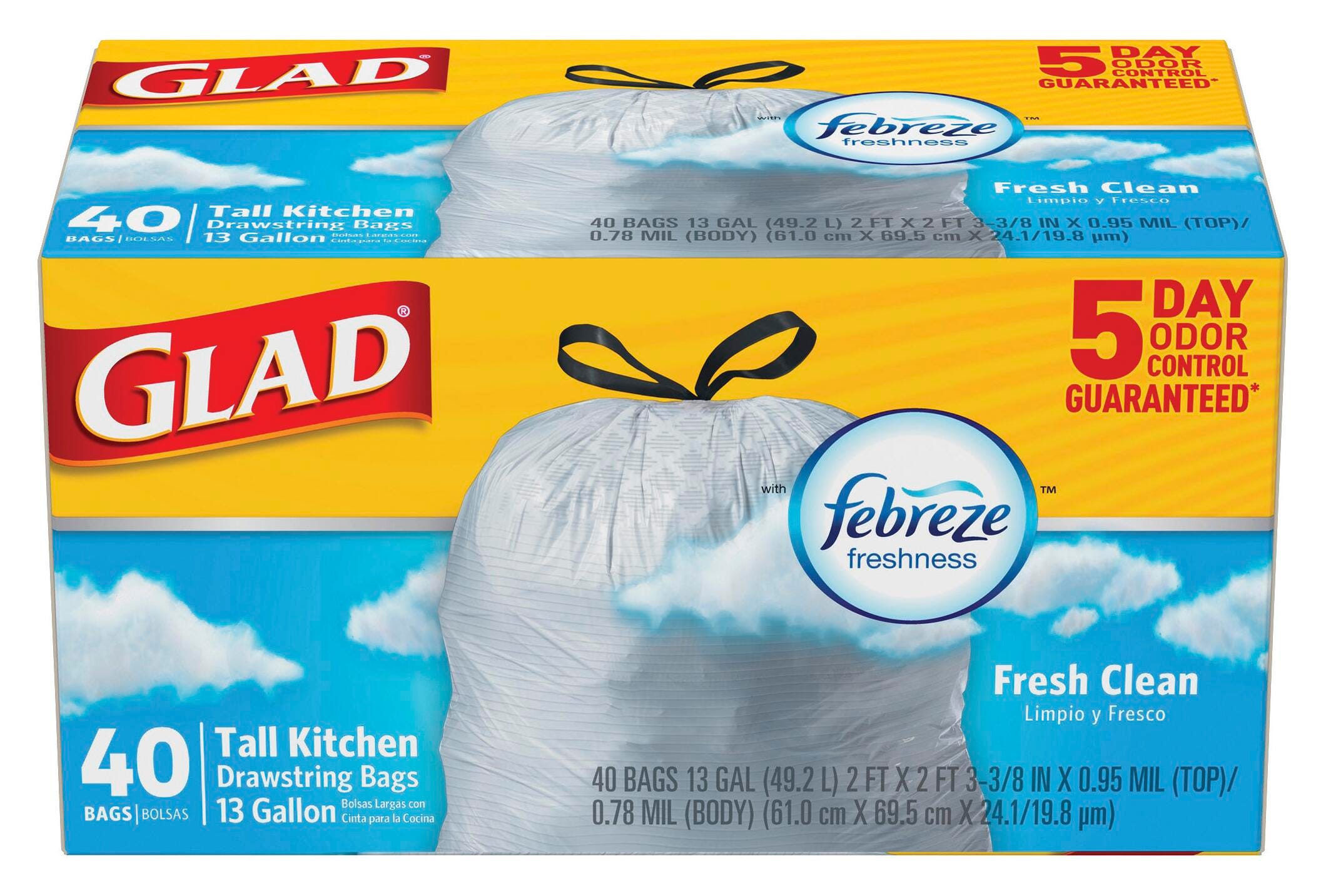 Glad OdorShield Tall Kitchen Bags provide all-day odor neutralization and freshness. Innovative reinforcing bands mean it's stronger and uses less plastic. When the bag is full, one quick pull of the sturdy, three-layer drawstring, and it's closed. Grab it by the handles, toss it away with ease and leave nothing behind but a fresh clean scent. This 13-gallon size fits tall garbage bins and is great for a kitchen or busy home office.