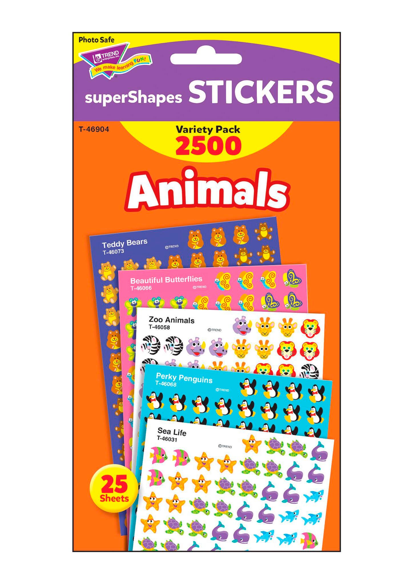 Trend Enterprises Supershapes Sticker Animal Variety Pack comes with acid-free, non-toxic as well as photo-safe stickers featuring cute kittens, teddy bears, playful penguins and butterflies designs. Pack with stickers measuring 13/32 in is great for incentive charts and pads. It includes 25 sheets to offer 2500 stickers.Features