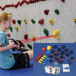 Fitwall Full StartFit System is designed to work with any climbing wall, turning your wall into a dynamic resistance-tubing fitness center. Students can perform lateral raises and bicep curls and more. Set includes 1 StartFit guide, 11 instruction cards, 13 StartFit holds, 3 StartFit step holds, 7 easy strength resistance bands with handles and 9 medium strength resistance bands with handles. Climbing Wall sold separately.