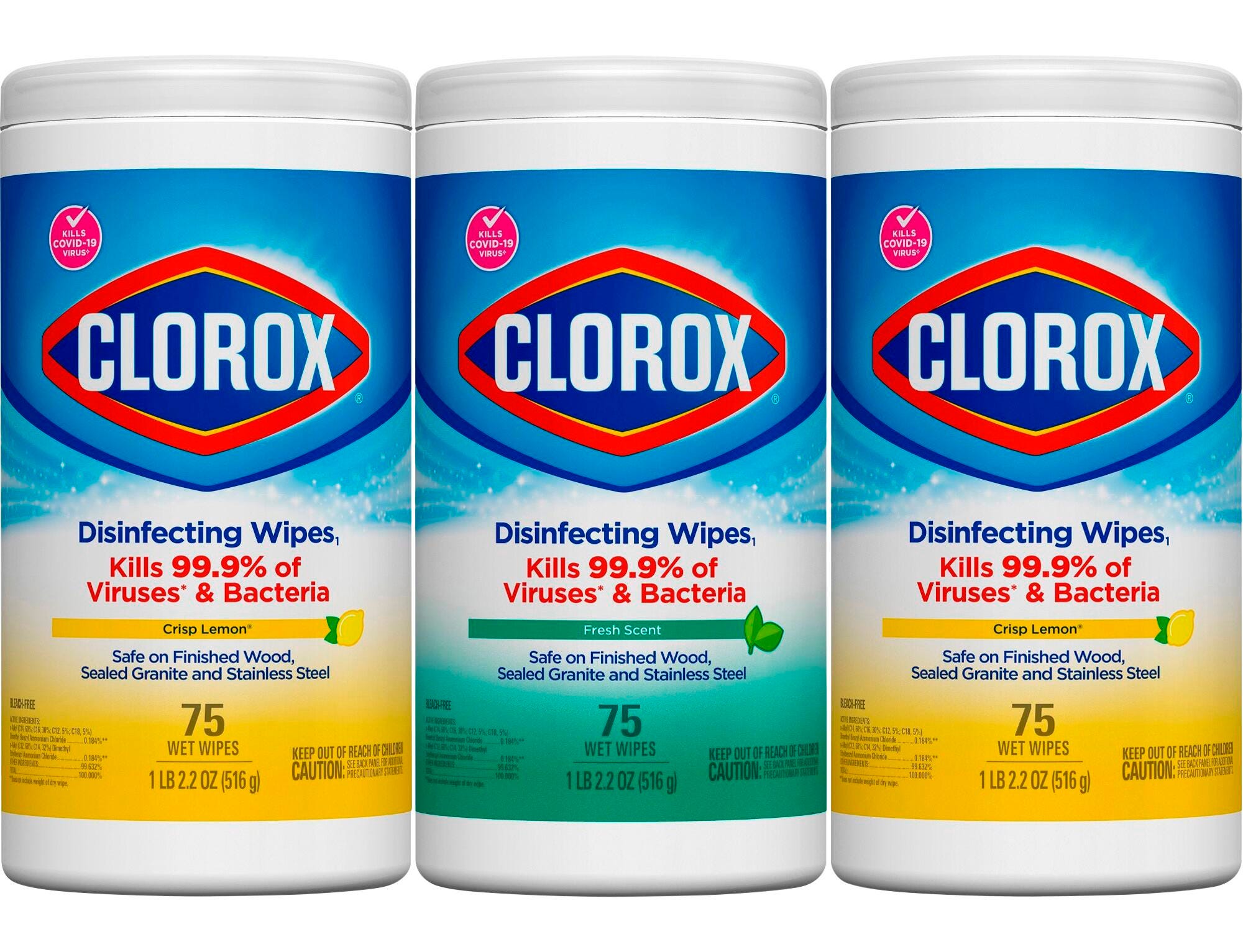 - Three containers of Clorox Bleach-Free Disinfecting Wipes, each with 75 sheets