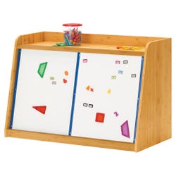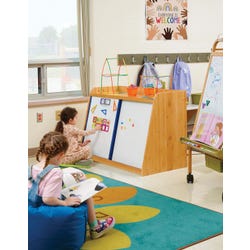 This shelf is both a storage and activity center, the top shelf is at a height that is easily accessible to early childhood students to play, and the three shelves below plus small, divided tubs and large open tubs offer storage for other classroom supplies. The sliding magnetic whiteboard panel is not only a place for creative play, but it also functions as a cover to allow educators to display certain items and supplies and hide when needed.Features