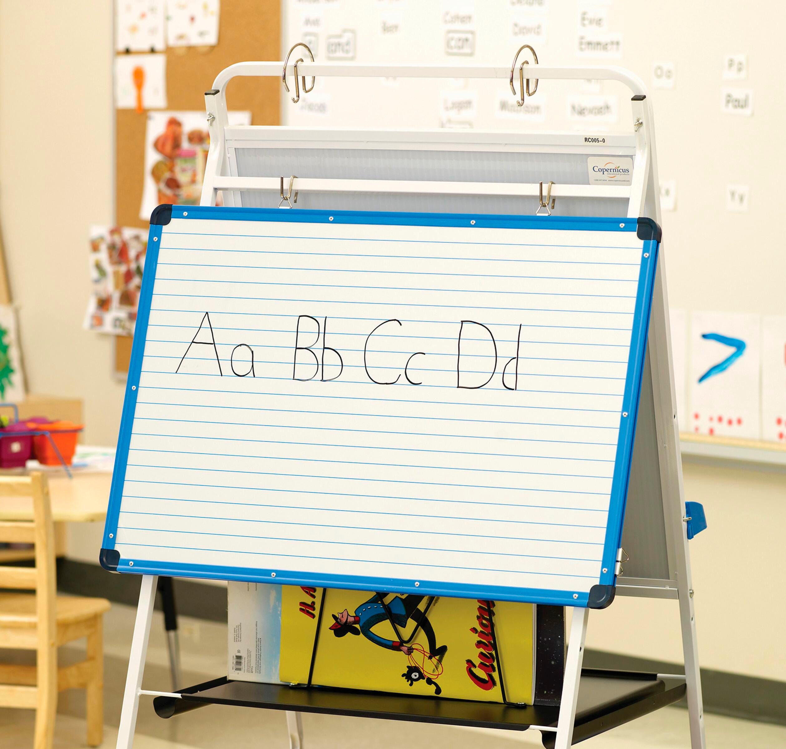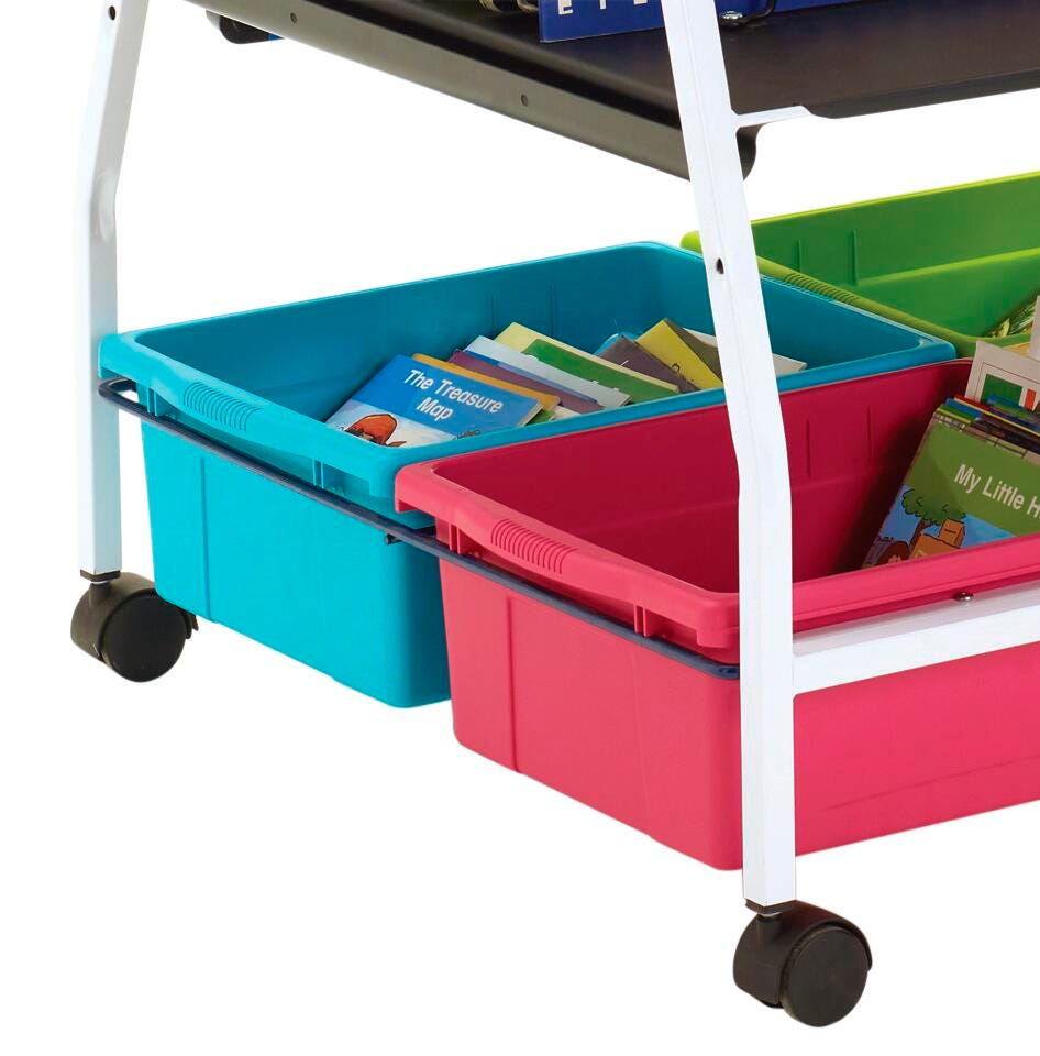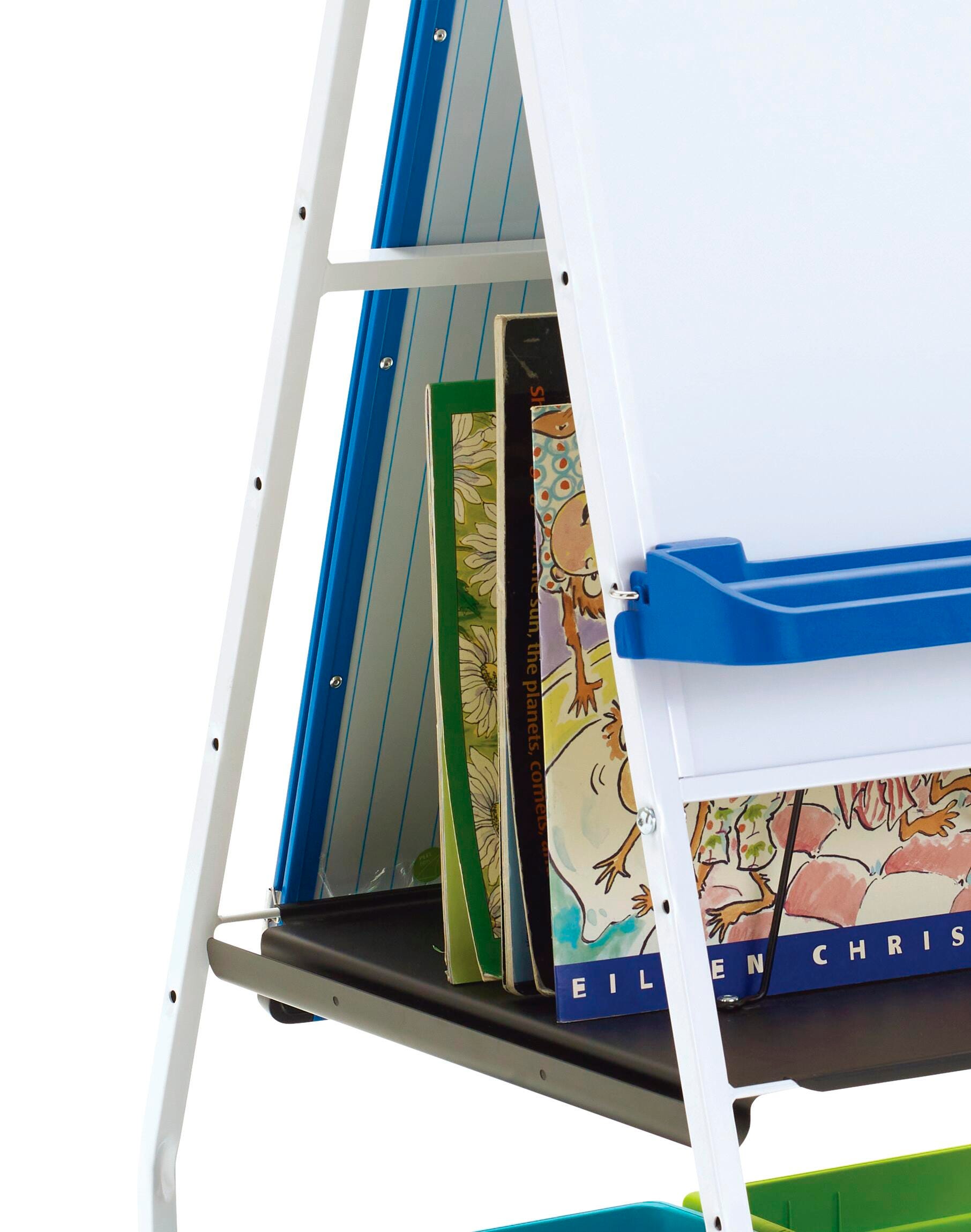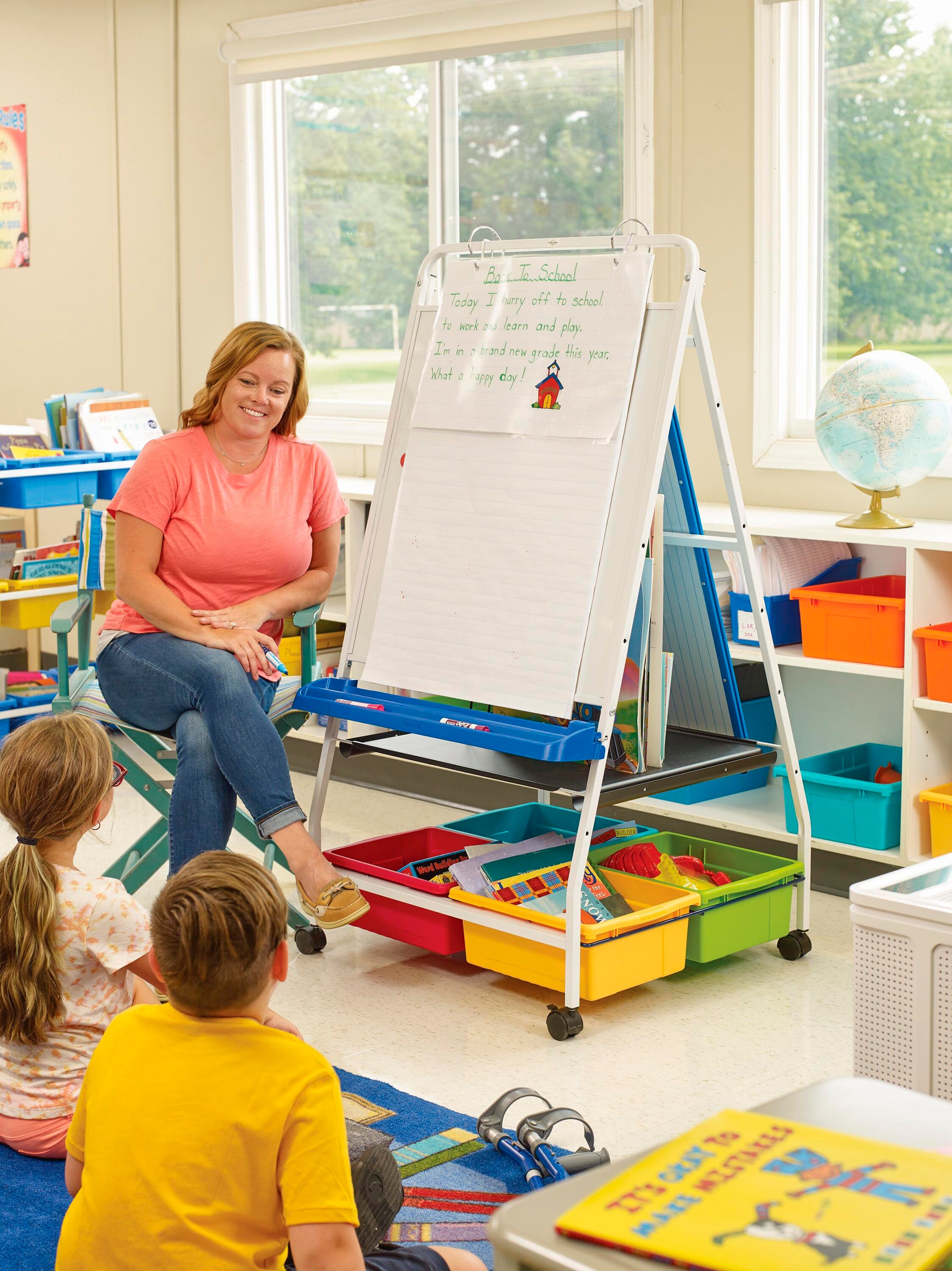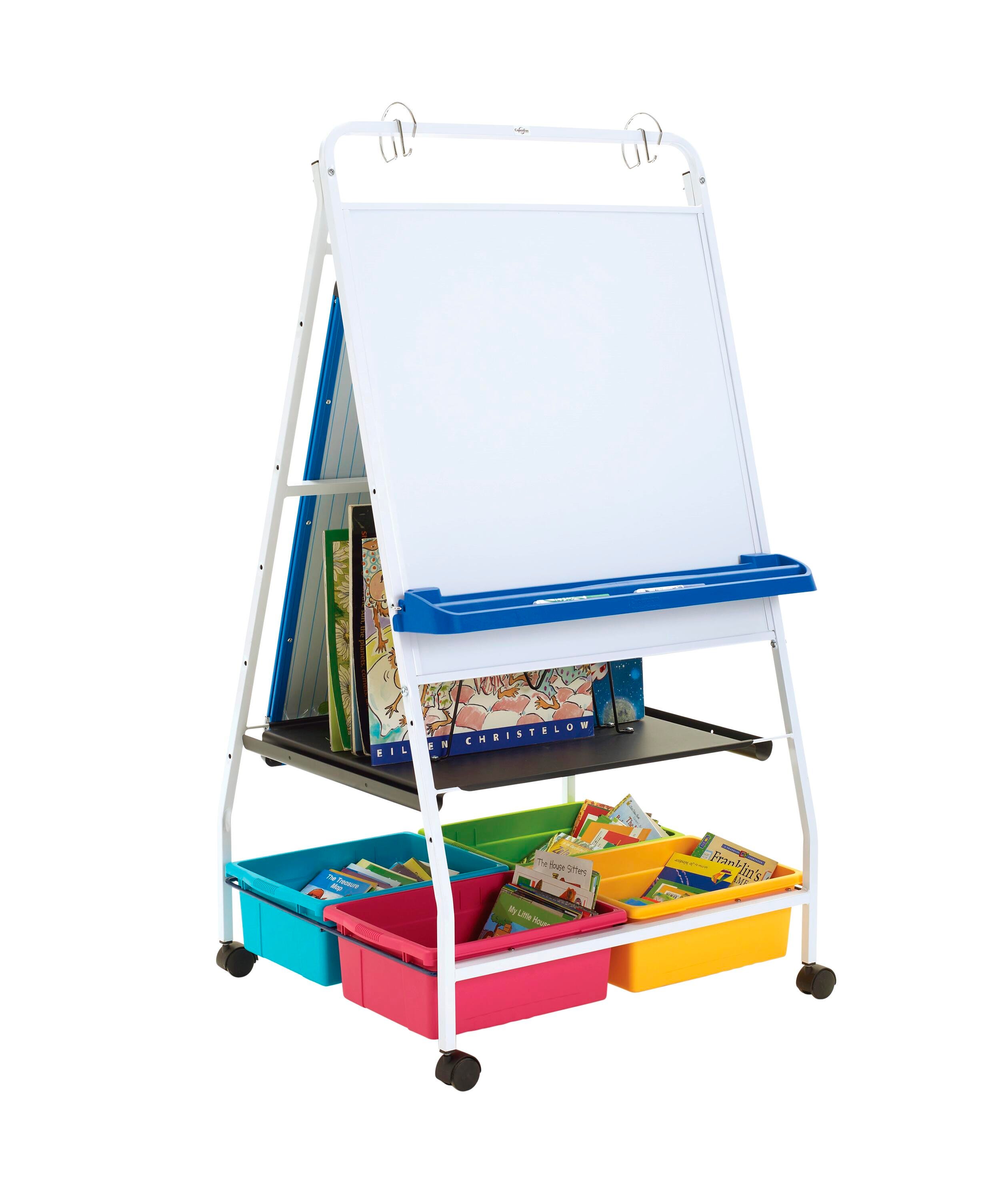 This easel is now available with see-through hinged lids that make it easy to keep things tidy and allows the tubs to be stacked when not in the cart. The hinge eliminates the need to remove the lid when accessing materials inside, so no missing lids! The award-winning Royal Reading Writing Center's unique features help you teach more efficiently while engaging your students. This easel is an essential teaching tool for all primary and junior classes. It combines a chart stand, storage for books and materials, dry-erase surfaces, and a book ledge for storytime.