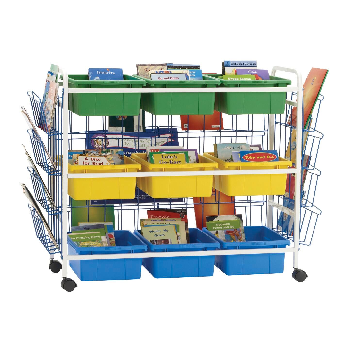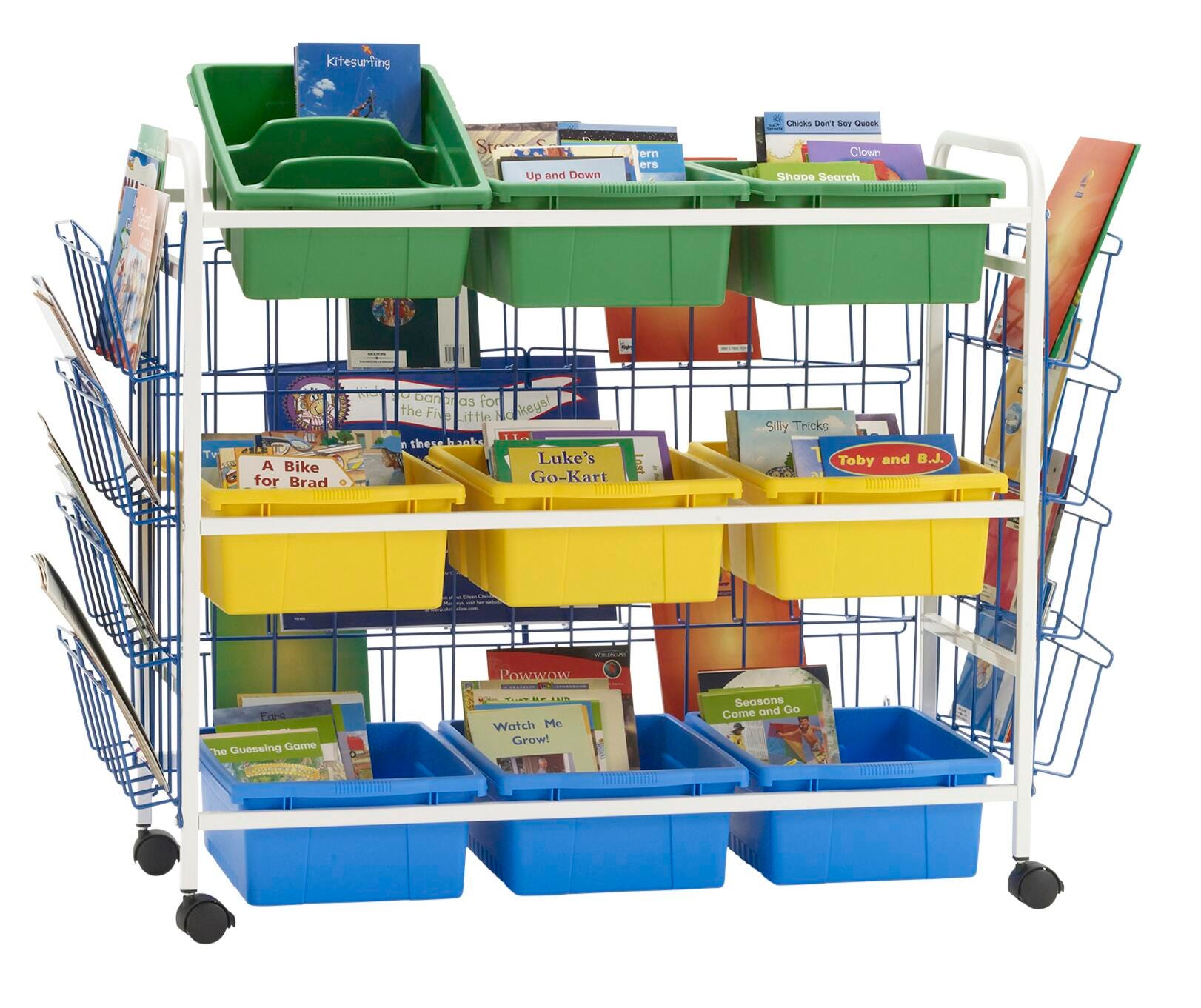 With three rows of deep tub storage, there are endless organization possibilities within the classroom or library. These carts are the ideal height for students and teachers to easily view and take books. All carts feature four 2-inch locking casters. Lifetime frame and tub warranty. Open Tubs measure 12 W x 15 D x 6 H inches. Divided Tubs measure 12 W x 15 D x 6 H inches. Frame measures 49 W x 21 D x 36 H inches. Deluxe browsers include 2 small and 1 large book display racks.Features