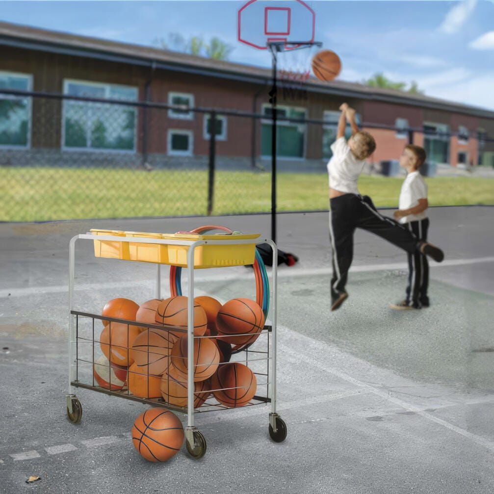 Copernicus Phys Ed Cart keeps all of your equipment organized, accessible, and mobile. The Phys-Ed Cart will keep you ready for the next activity during recess or Physical Education class. Quickly and easily move equipment from indoors to outdoors and from room to room. Large metal basket fits up to 20 basketballs. Features 5-inch casters, 2 of which lock. Frame measures 41 W x 23 D x 44 H inches; open tubs measure 12-1/2 W x 15 D x 6 H inches. Ten-year frame warranty; lifetime tub warranty.