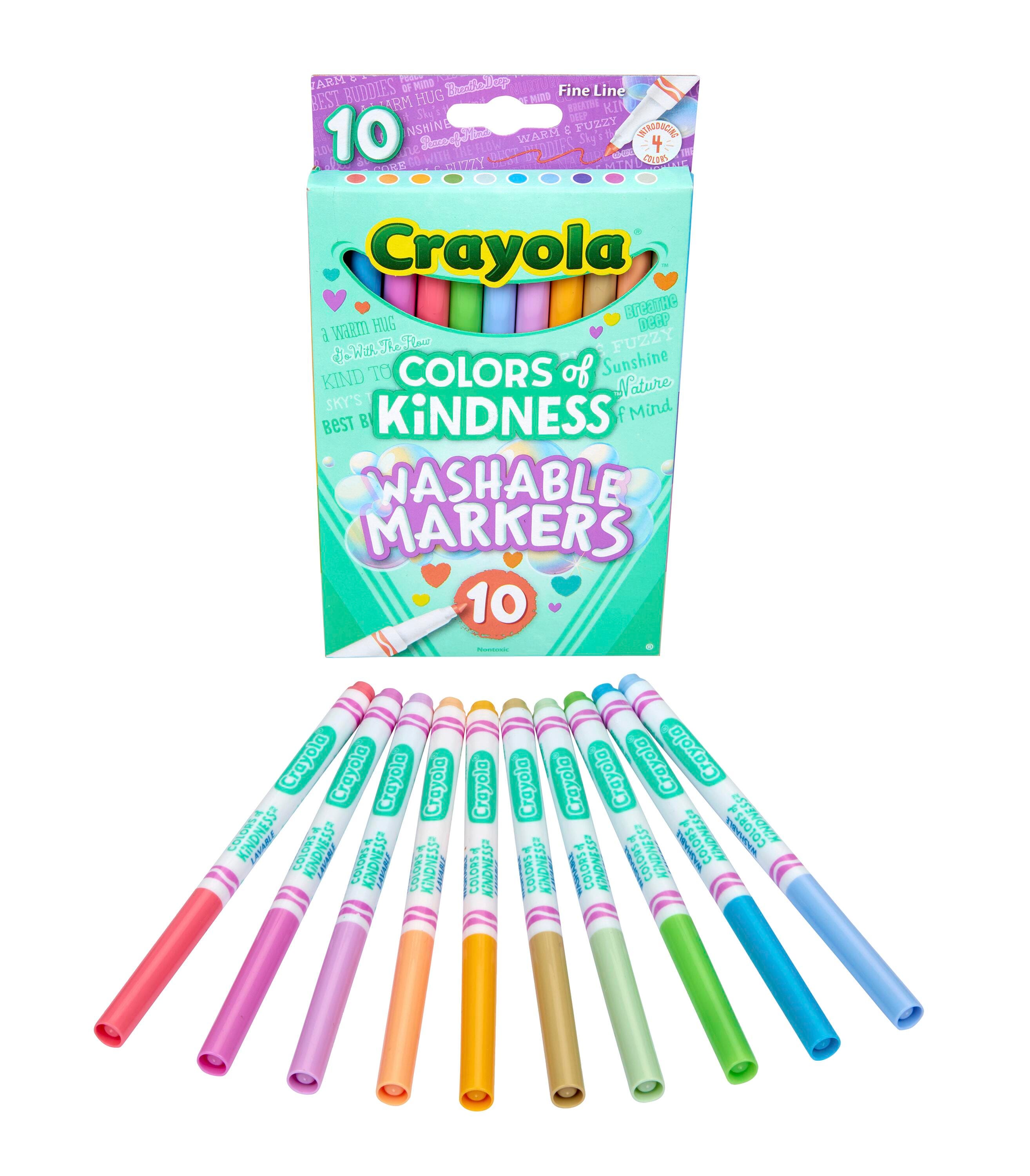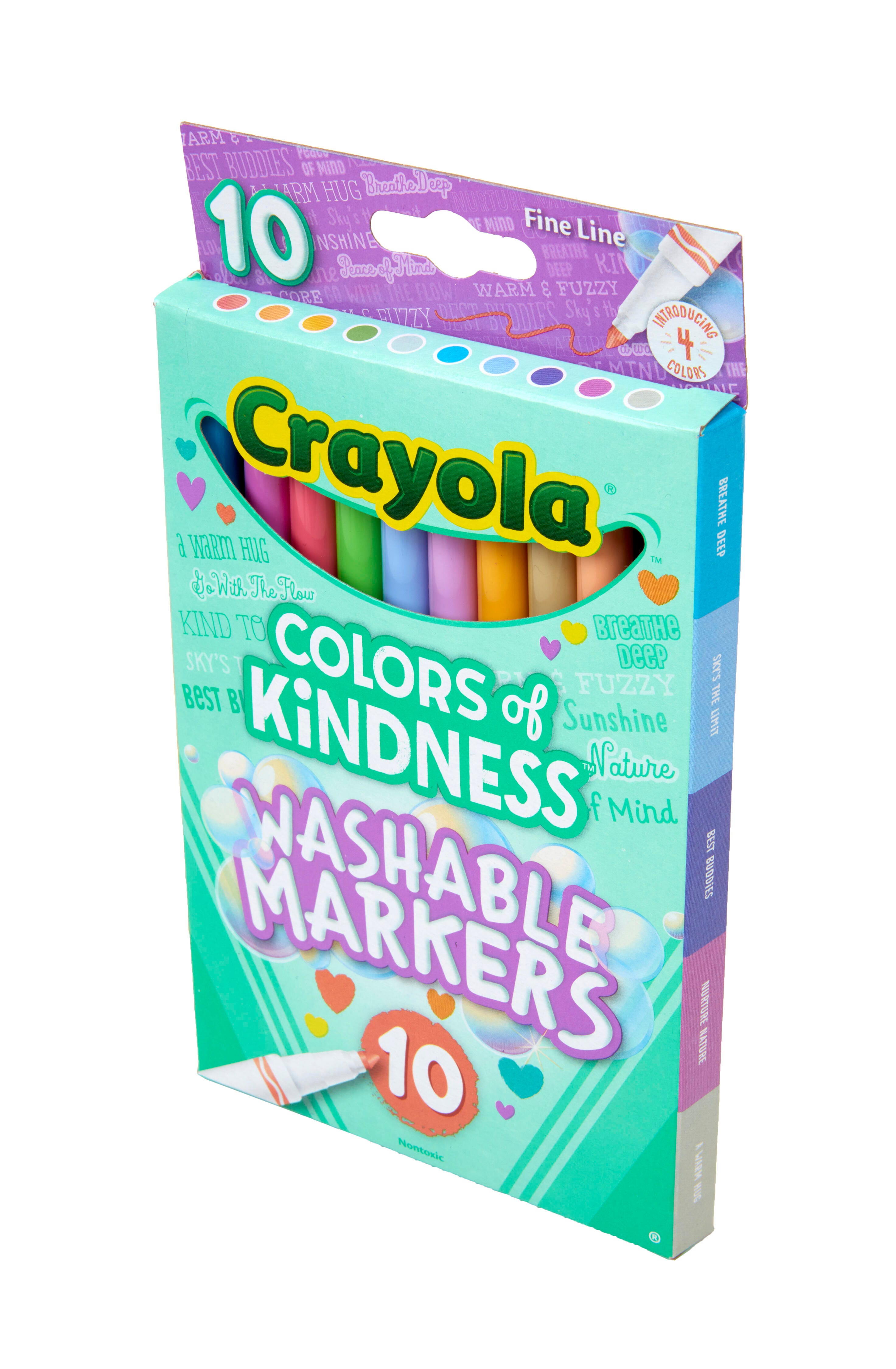 Spread the love with a pack of Crayola Colors of Kindness Fine Line Markers. It's the perfect box of coloring supplies for artists who like to live life on the sunny side! This set delivers 10 art markers with special-edition color names that help spread creativity and positivity. The markers have fine line tips that are ideal for drawing thin lines or coloring in precise detail. Perfect for coloring books, crafting, and art projects, these unique markers offer vibrant color and are made to last. The set contains 10 markers, 1 each in the following colors: Cool Mint (Peace of Mind), Crayellow (Hello Sunshine), Powder Blue (Sky's the Limit), Oatmeal (A Warm Hug), Salmon (Go With The Flow), Peach (Warm & Fuzzy), Granny Smith Apple (Kind To The Core), Turquoise Blue (Breathe Deep), Wisteria (Best Buddies), Orchid (Nurture Nature).Features