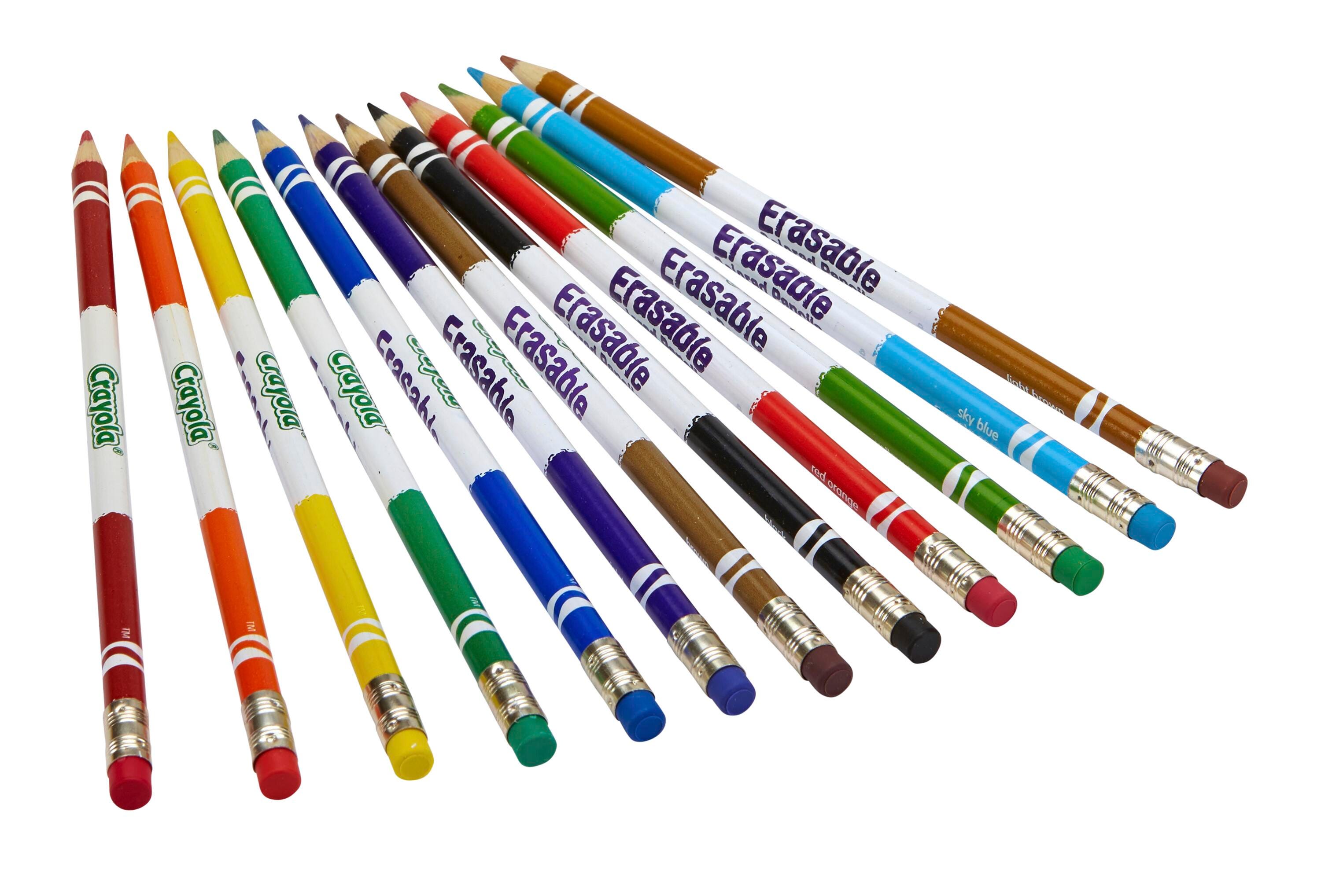 The Crayola Erasable Colored Pencils make it easy to create picture-perfect coloring pages, crafts, and drawings. Each colored pencil is conveniently equipped with a high-quality eraser that makes corrections a breeze, so young artists can make changes when needed. The thick lead tips are soft for laying down smooth, non-scratch color, and won't break easily under pressure. This set contains 12 erasable colored pencils, 1 each of the following colors: red, red orange, orange, yellow, yellow green, green, sky blue, blue, violet, black, brown, and light brown.Features