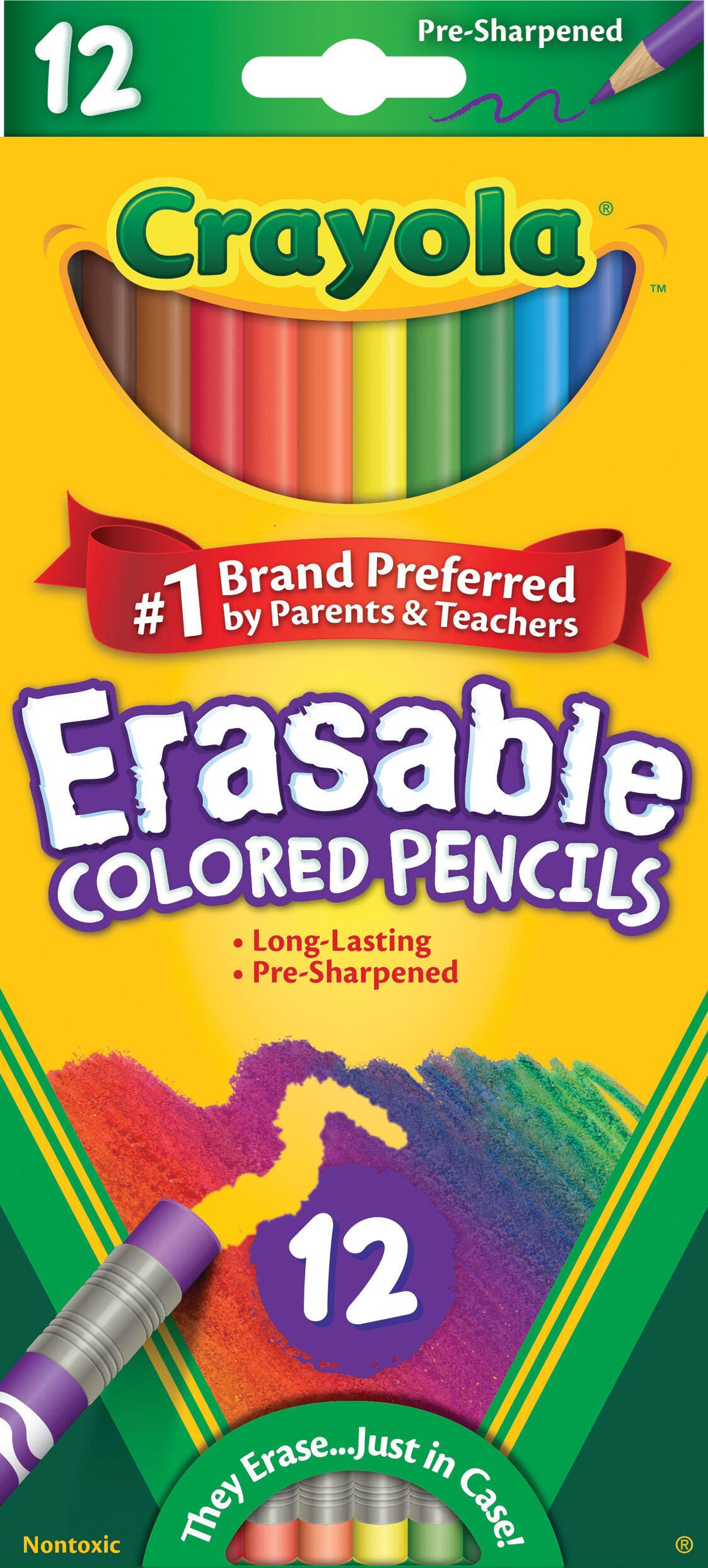 The Crayola Erasable Colored Pencils make it easy to create picture-perfect coloring pages, crafts, and drawings. Each colored pencil is conveniently equipped with a high-quality eraser that makes corrections a breeze, so young artists can make changes when needed. The thick lead tips are soft for laying down smooth, non-scratch color, and won't break easily under pressure. This set contains 12 erasable colored pencils, 1 each of the following colors: red, red orange, orange, yellow, yellow green, green, sky blue, blue, violet, black, brown, and light brown.Features