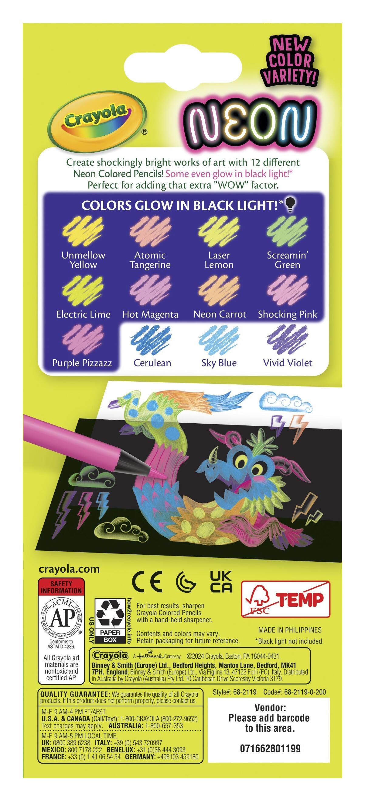 Step into a world where drawings come to life with this set of Crayola Neon Colored Pencils! These spectacular pencils bring a dazzling light show right to your fingertips, inspiring eye-catching creativity during any project. They are great for drawing, writing, coloring, and more! A rainbow of neon fun awaits with this set that includes 12 pre-sharpened colored pencils in an assortment of colors.Features