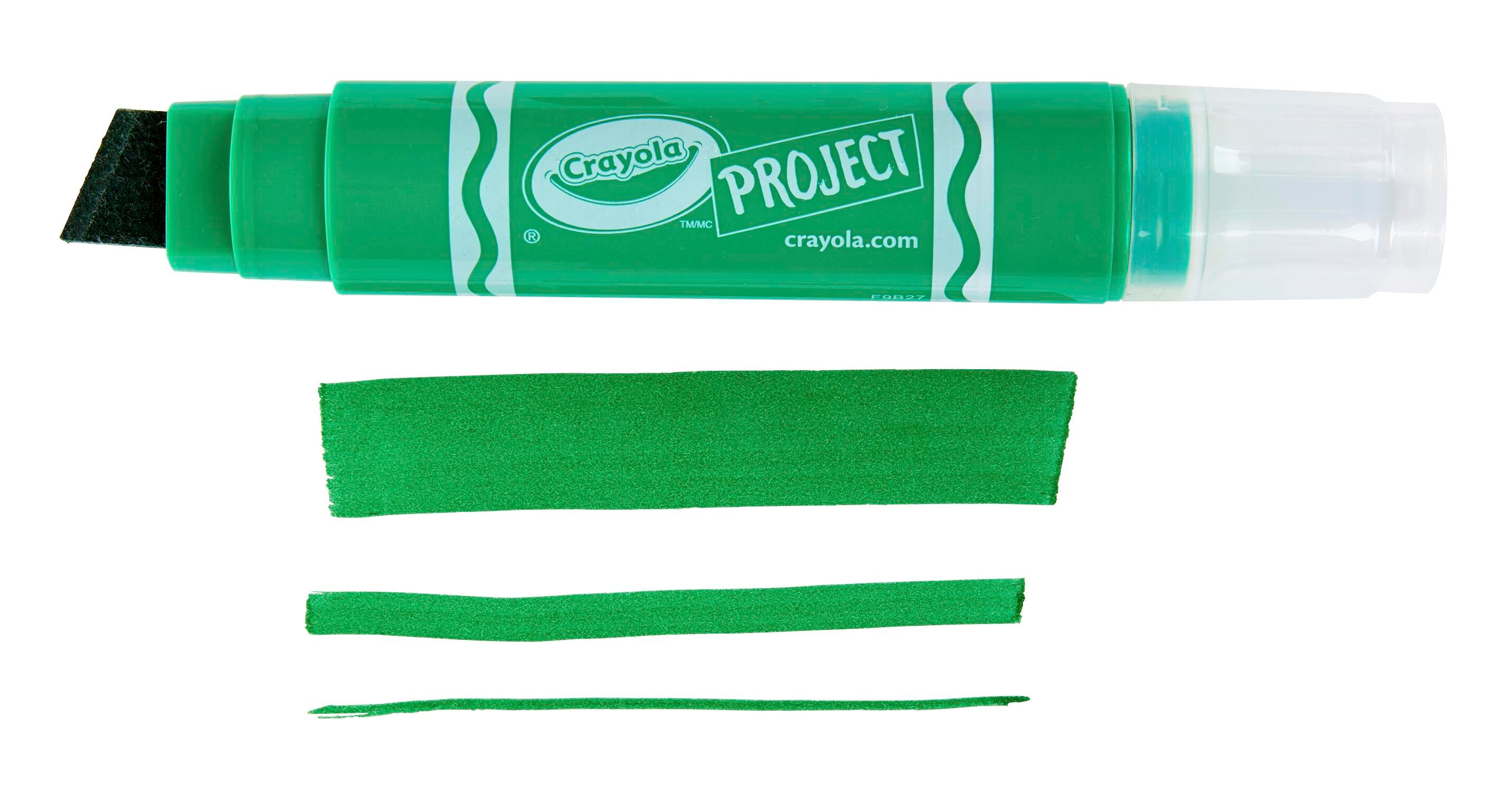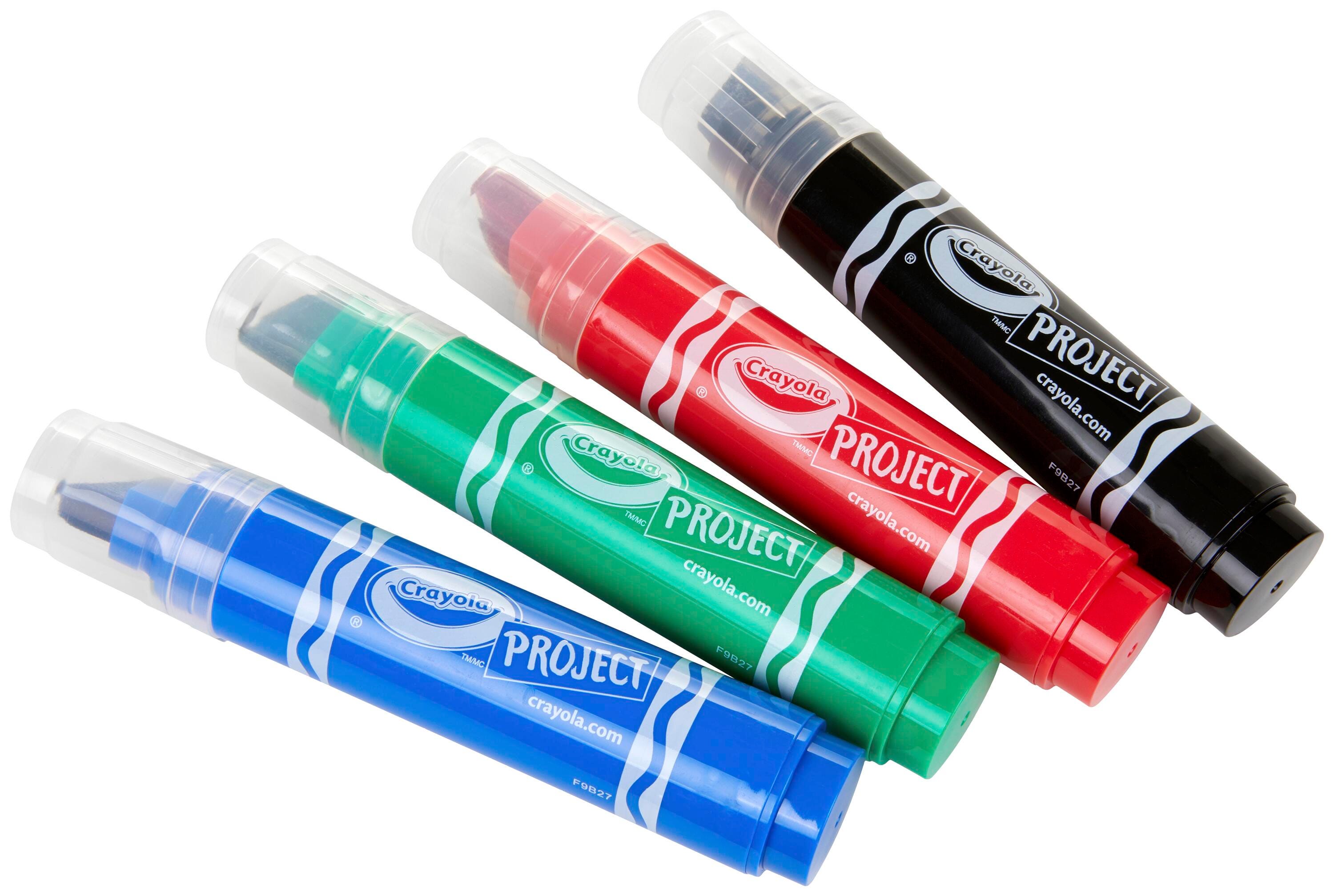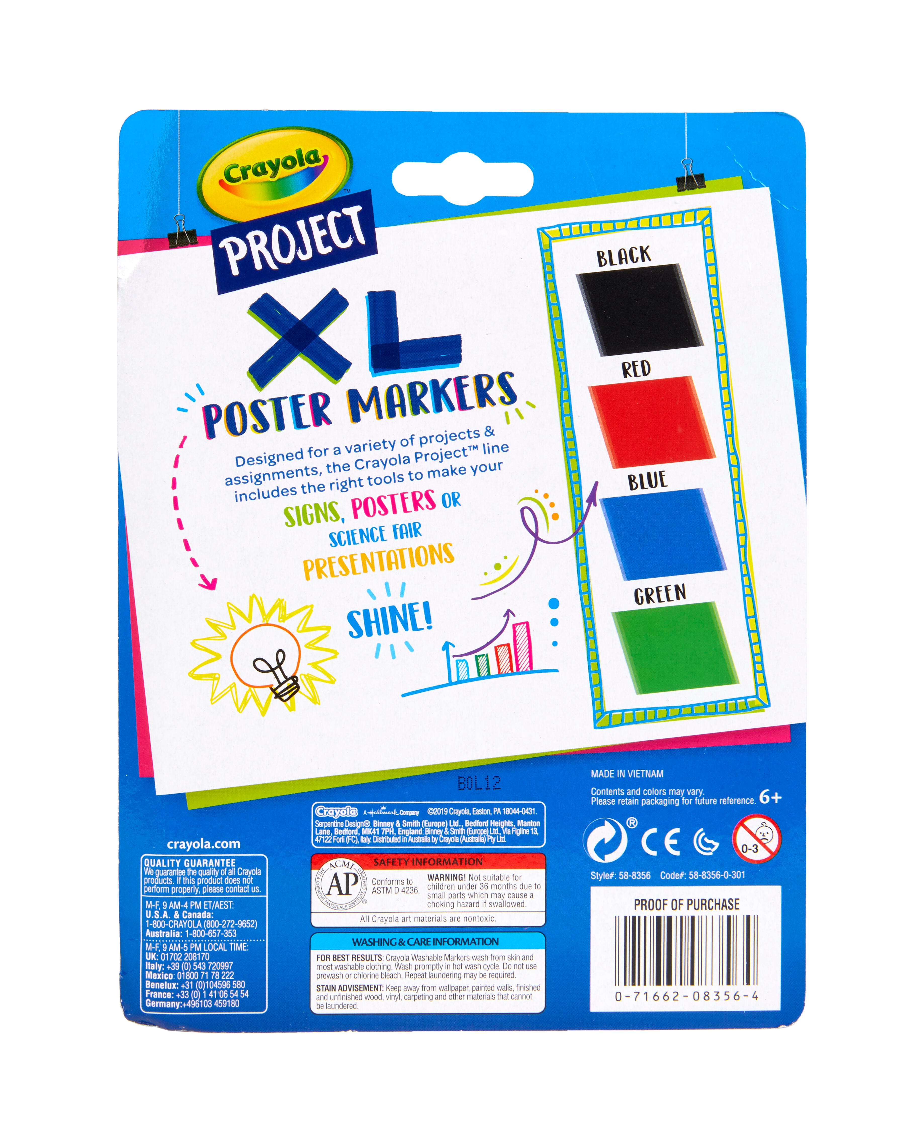 The Crayola Project Poster Markers are a great addition to any school or home project. These extra-large markers are perfect for a variety of full-coverage arts and crafts projects and deliver bold lines and vibrant color. Recommended for ages 6 and up. This set contains 4 markers, 1 each of the colors black, red, blue, and green.