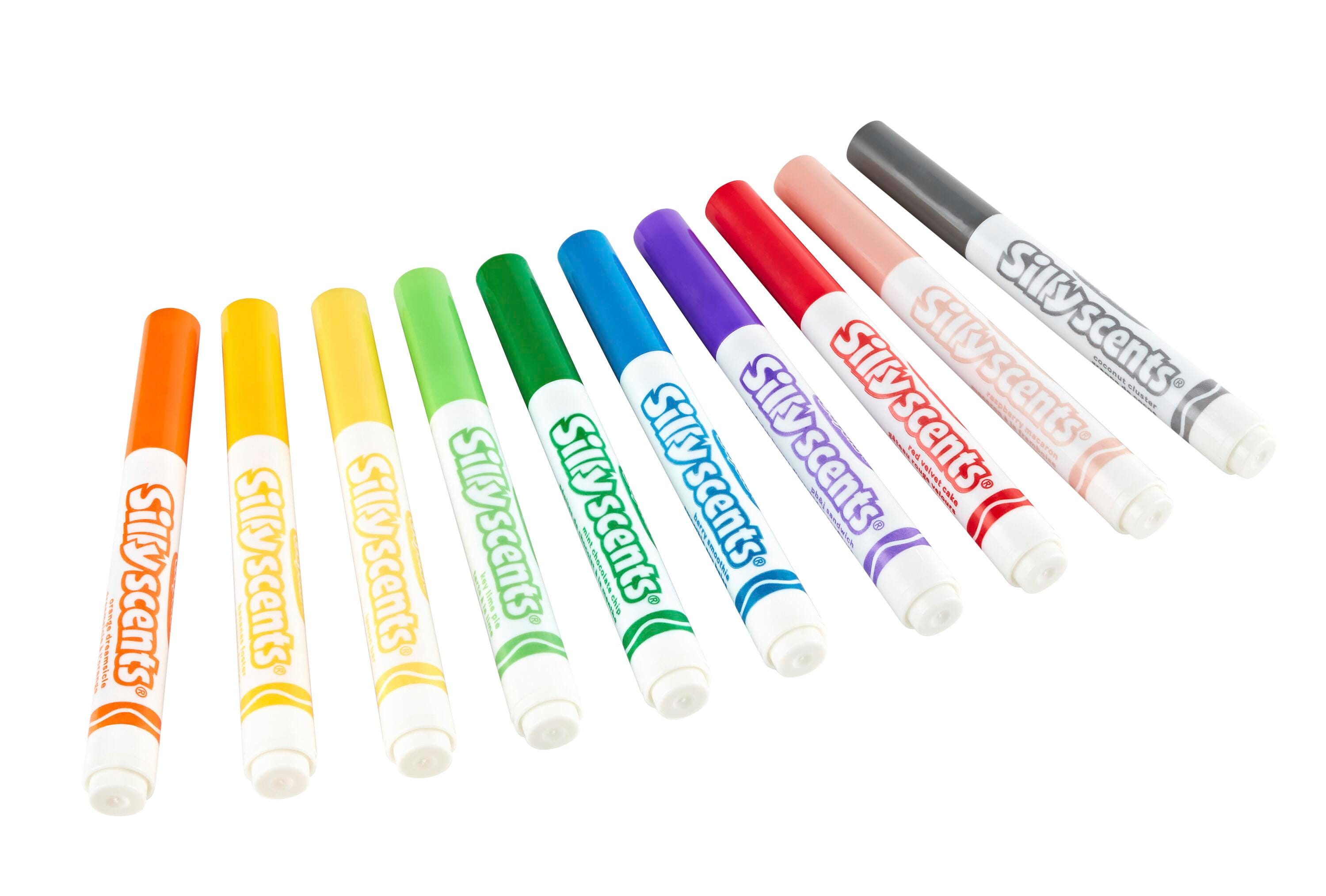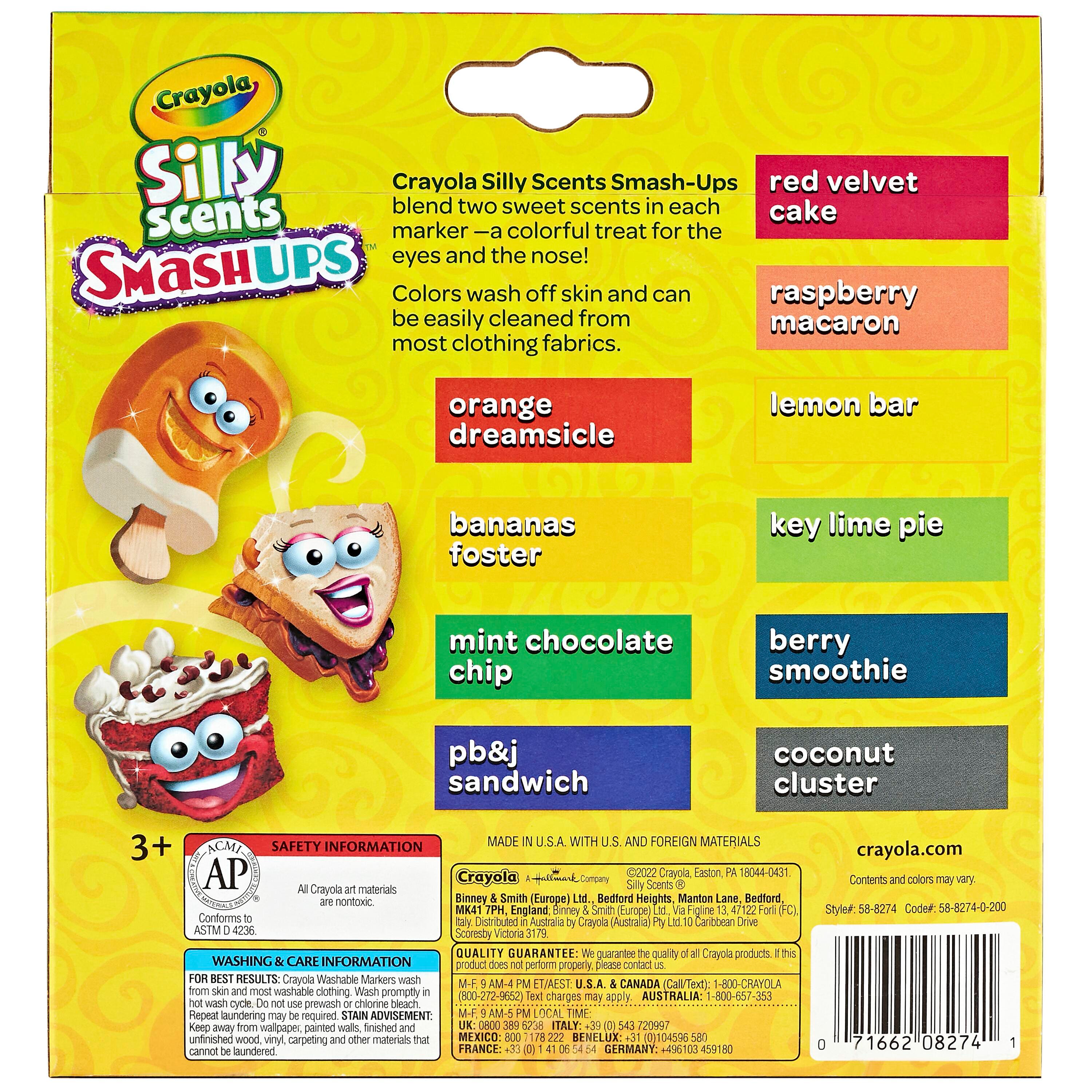 The Crayola Silly Scents Washable Markers you know and love are now available in Smash Ups! This set of sweet-smelling markers is great for art projects and coloring in the classroom, at home, or on the go. Each marker combines two unique scents into one, so your creations look and smell great. They have a broad-line conical tip that lays down wide strokes and thin lines for coloring, drawing, writing, and more. Plus, the washable formula keeps the colors where you want them, making it easy to wash stray marks from skin, clothing, and even walls. This set includes 10 markers, 1 each in the following colors/scents: Orange Dreamsicle, Bananas Foster, Lemon Bar, Key Lime Pie, Mint Chocolate Chip, Berry Smoothie, PB&J Sandwich, Red Velvet Cake, Raspberry Macaron, and Coconut Cluster.Features